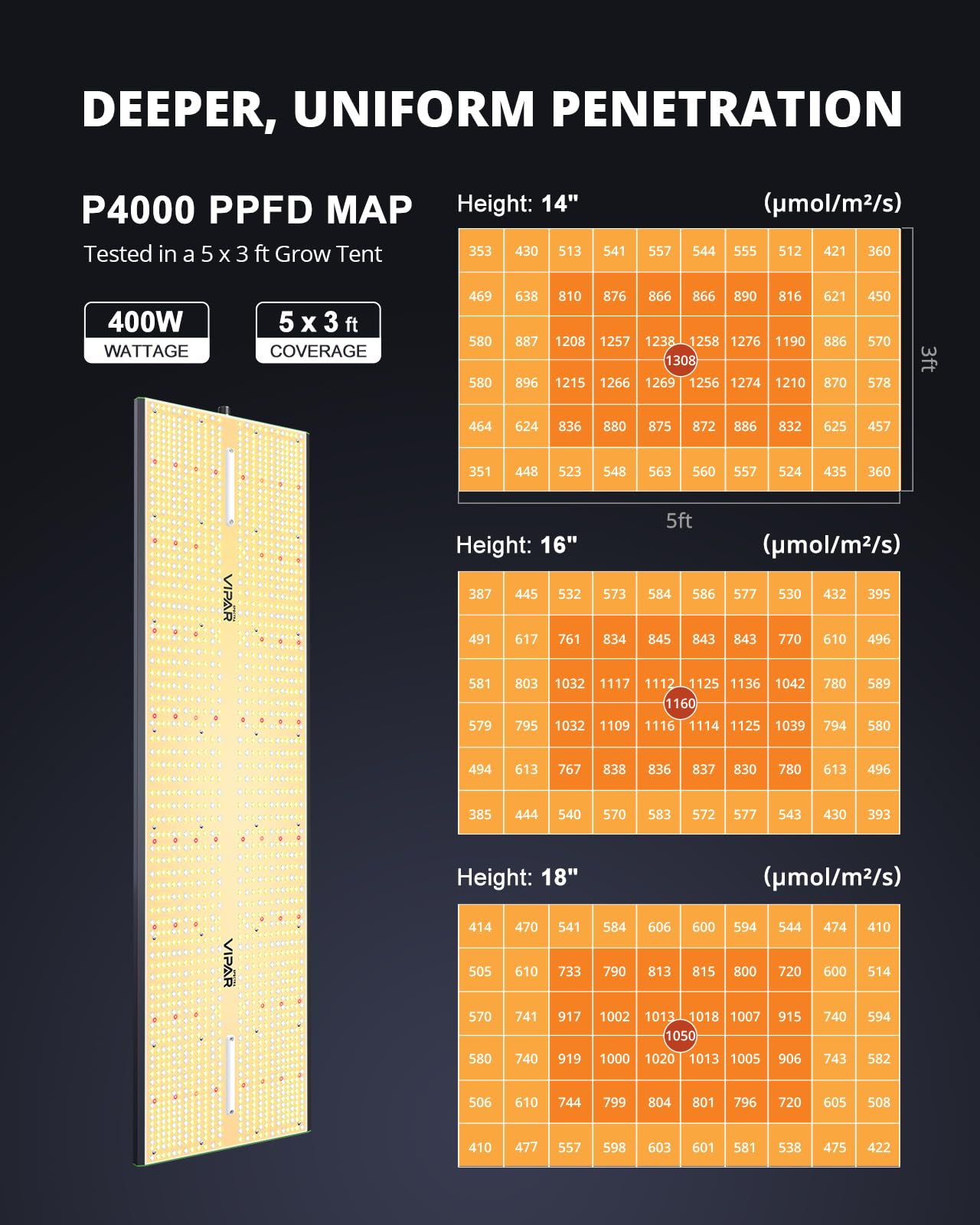 Outstanding Design: HIGH EFFICIENCY GROW LIGHT–VIPARSPECTRA spectrum has been developed by indoor growers over many years of careful experimentation and testing. The P4000 provides optimal full spectrum by concentrating energy on wavelengths that are most beneficial for all indoor plants’ need, rapid plant response from seed to flower.