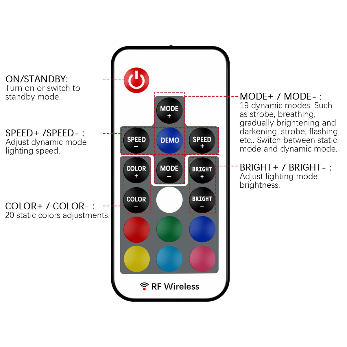 Includes 20 static colors and 19 dynamic modes for diverse lighting effects.