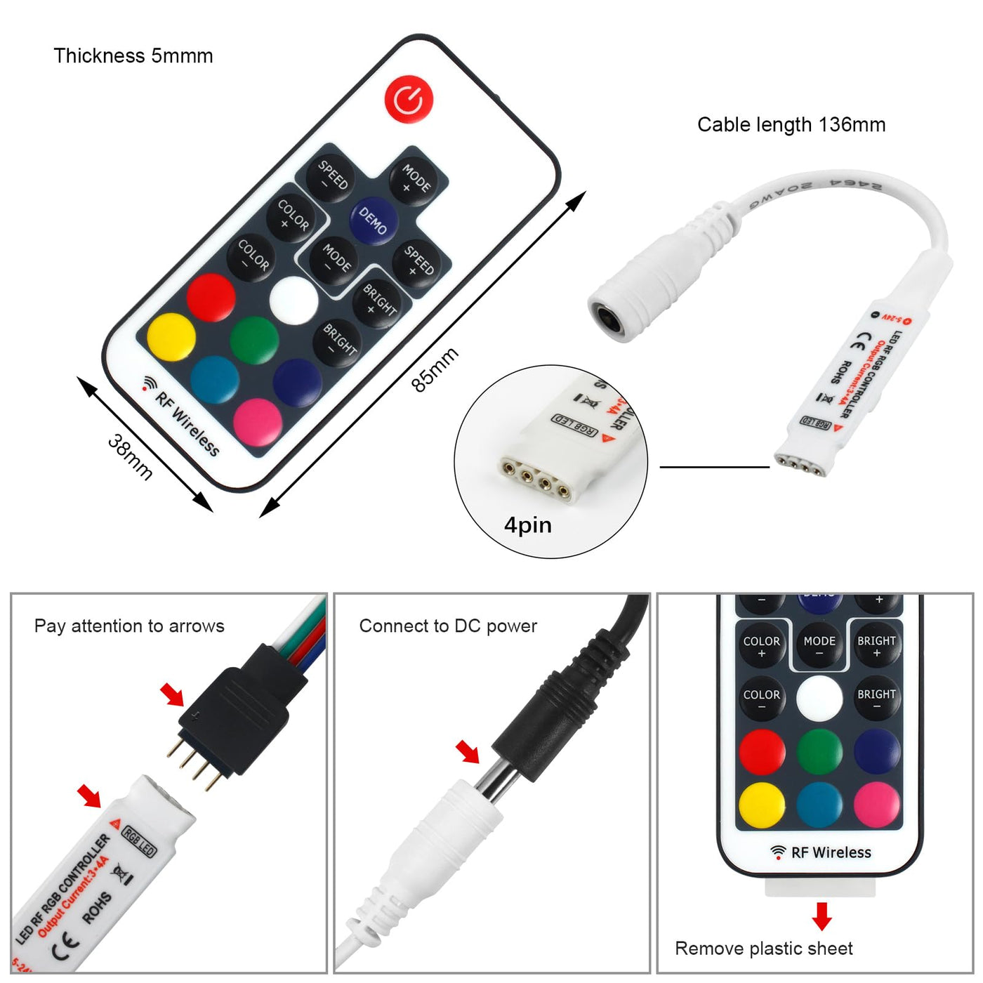 This RGB controller operates within a voltage range of 5V to 24V and features three output channels capable of handling up to 12A of working current. The advanced PWM (Pulse Width Modulation) technology ensures smooth and precise control of your lighting, while the 433MHz wireless signal enables effortless operation from a distance. The ultra-slim design of the remote is not only stylish but also includes a memory function that remembers your last settings for added convenience.