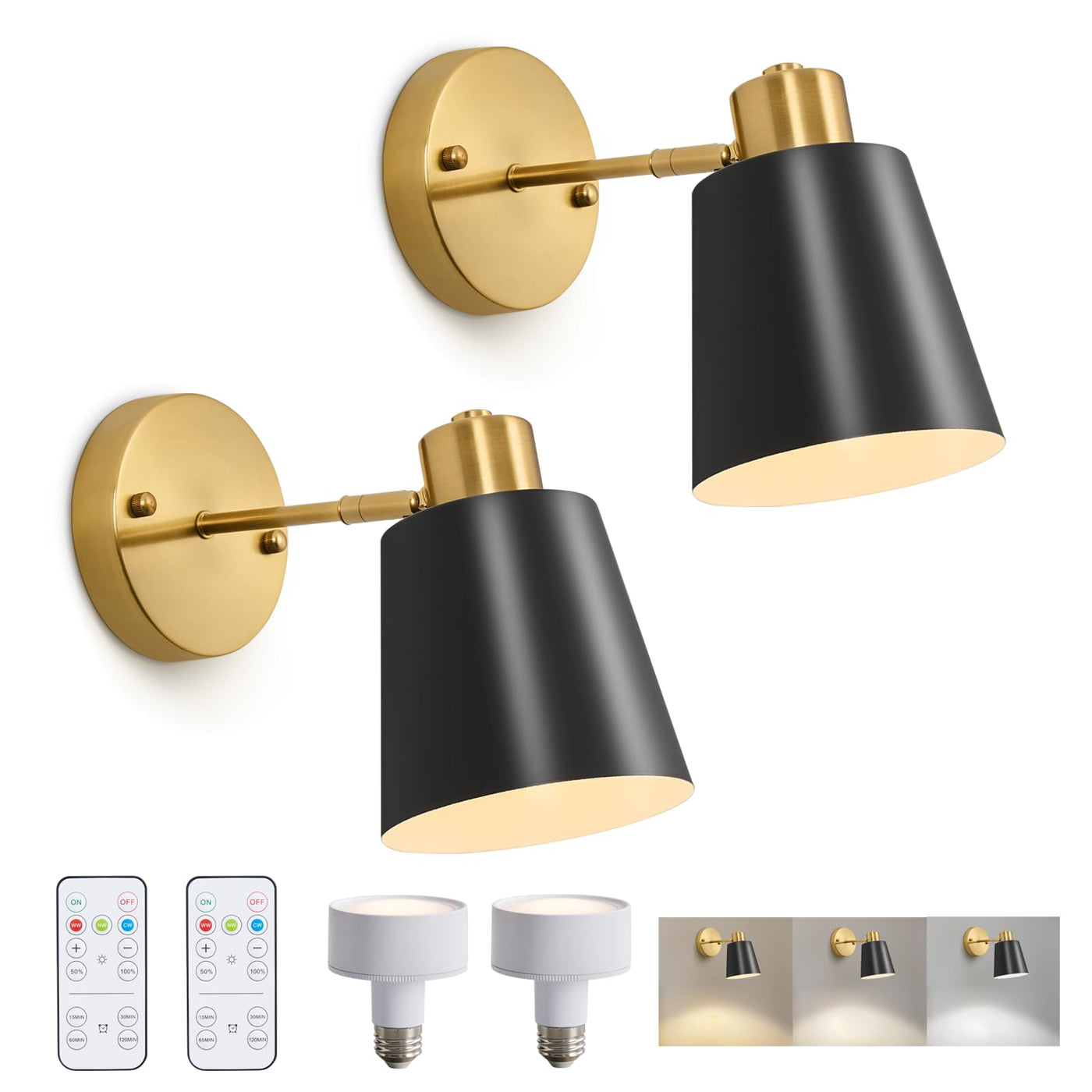 Vitnucrol 2 Pack Black And Gold Magnetic Wireless Battery Operated Wall Sconces, Dimmable Battery Powered Wall Decor Set Of 2, Cordless Wall Light Lamp With Remote Control For Bedroom Living Room