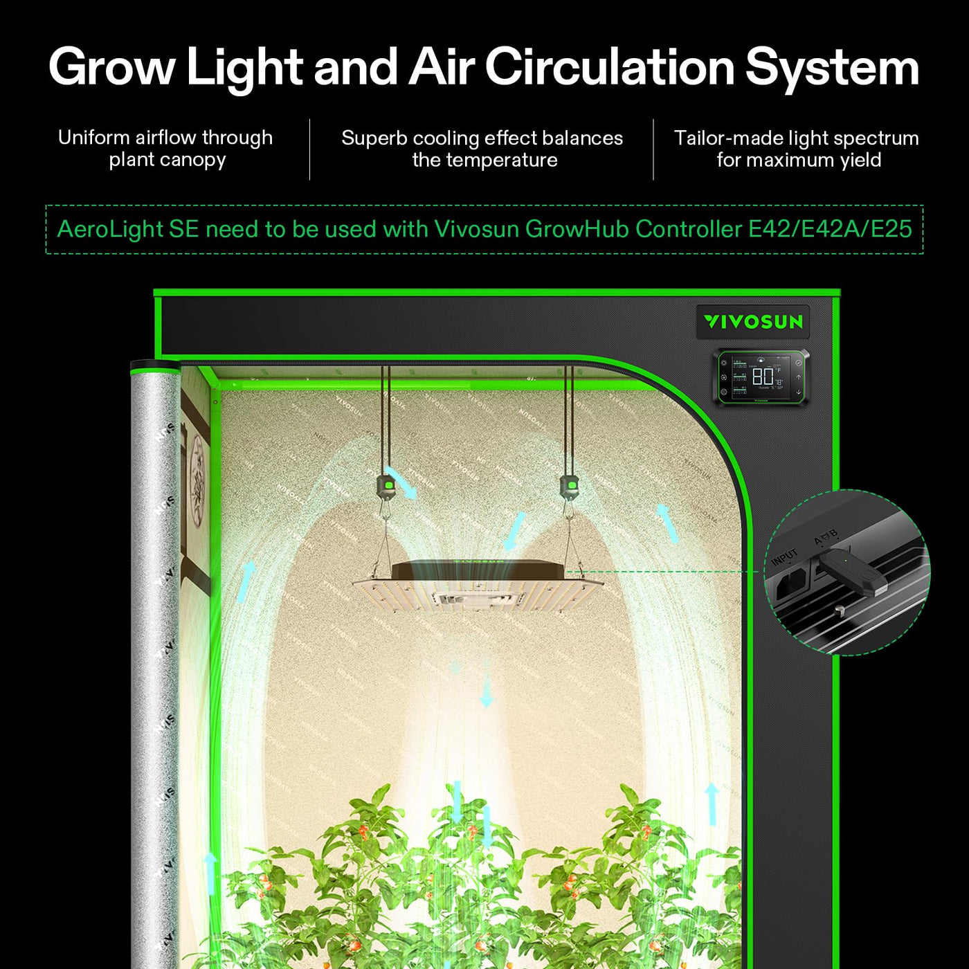 Q: How do I control the AeroLight A100SE and what additional equipment do I need?A: You can control the AeroLight A100SE using the VIVOSUN GrowHub Controller and App, which allows for automation and customization of light schedules. Note that the controller is sold separately and is necessary to access all advanced features.