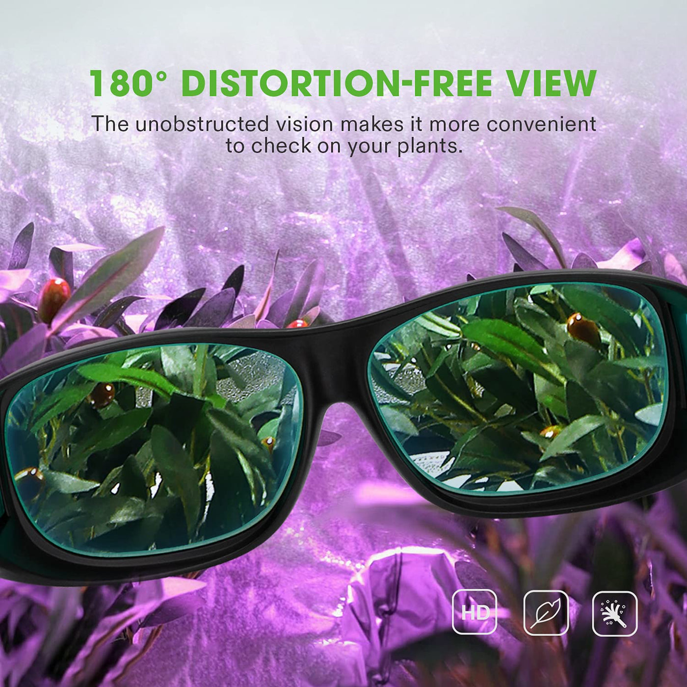 Q: How do the VIVOSUN glasses enhance visibility while working?A: These glasses feature a nine-base, wrap-around lens design that offers 180° of distortion-free, unobstructed vision. This design makes it easier to check on your plants and work comfortably in your grow room.