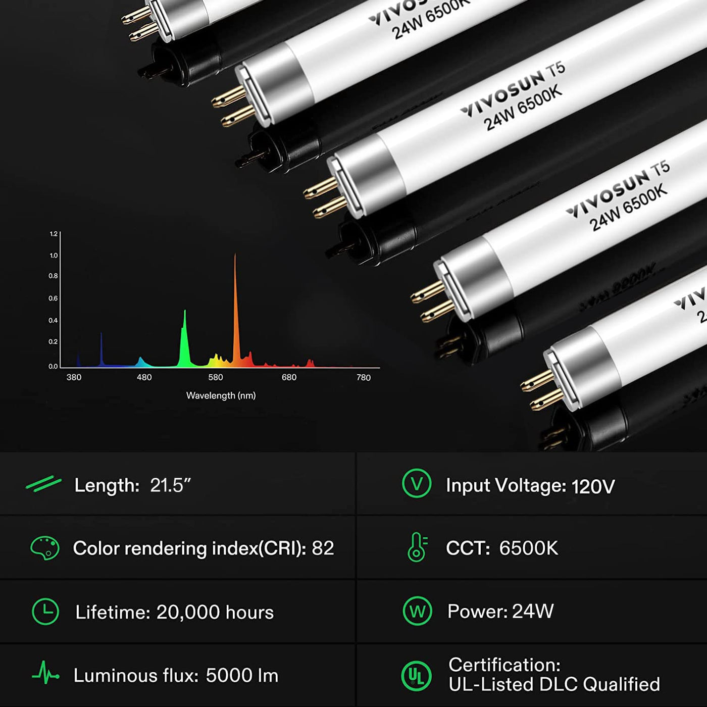 Vivosun T5 Grow Light Bulbs 2 Ft 22 Inches, 24W 6500K Ho Fluorescent Tubes Light Bulbs, Cool White T5 Bulb For 22 Inches T5 Light Fixtures, T5 Grow Lights For Indoor Plants, 2 Ft 24W Pack Of 5