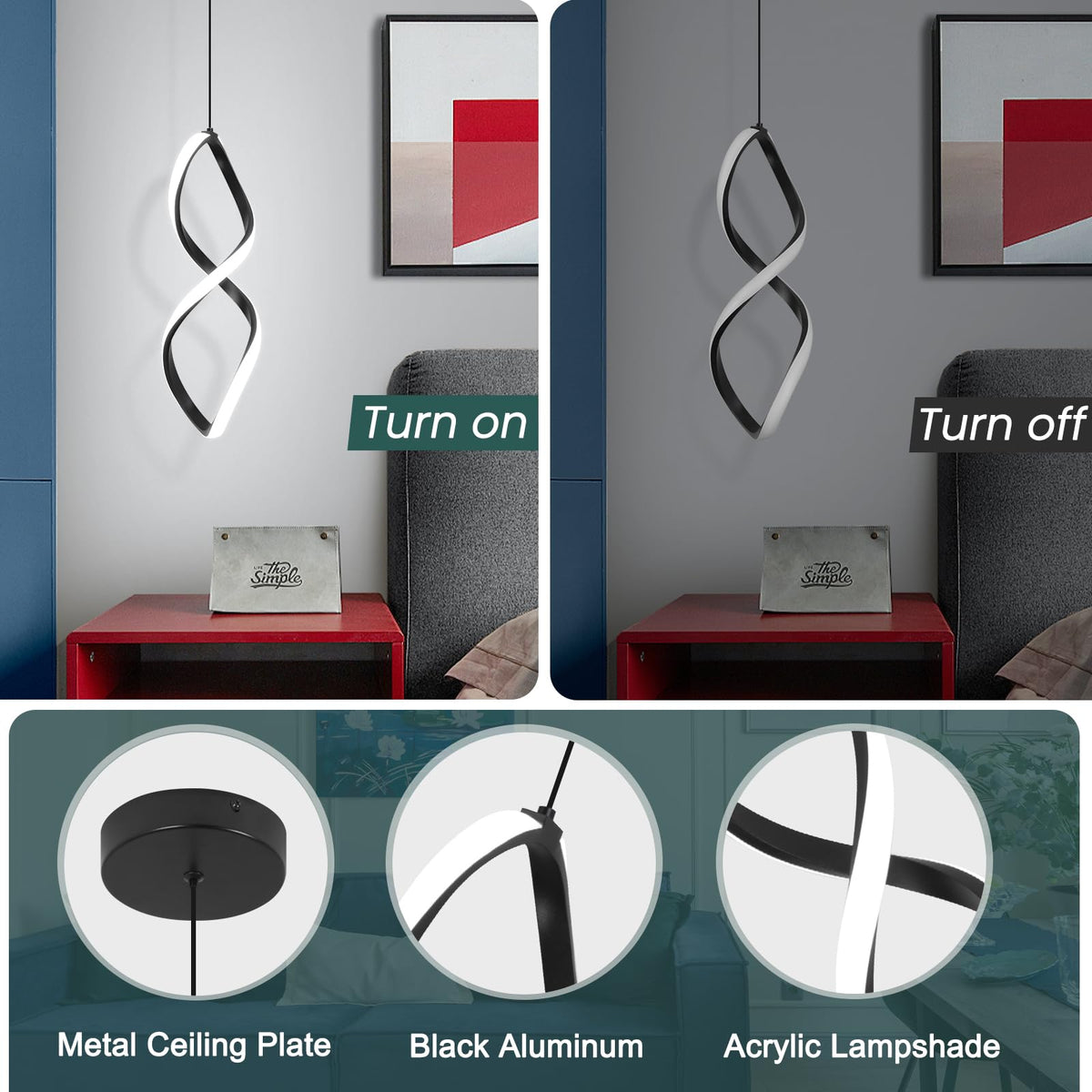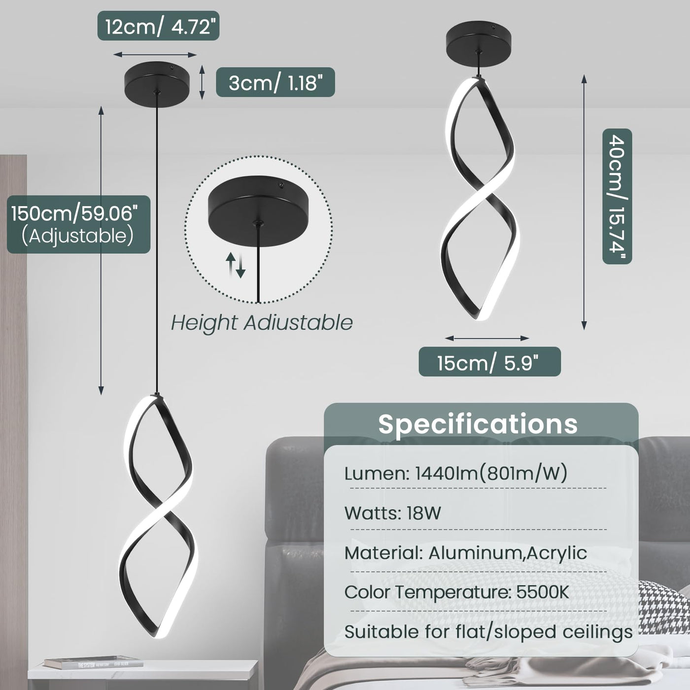 Specification Style: Modern/Simple/Creative Product Name: Led Pendant Light Body Color: Black Light Source: Led Voltage: 110-120V Power: 18W Lumen: 1440 Lm Cable Lenght: 59 Inch/150 Cm (Adjustable) Ceiling Box Diameter: 5.9''/15Cm Lamp Size: L4.7Xw4.7Xh15.7Inch Material: Metal,Acrylic And Aluminum Application: Living Room, Dining Room, Kitchen, Office, Bedroom, Hallway, Office, Corridor, Restaurant Modern Ceiling Light.&Nbsp; Package List 1 * Pendant Light 1 * User Manual 1 * Mounting Accessories Warm Tip Please Cut Off The Power When Install ,For Safe,We Suggestion You Ask Professional Electrician To Finsh Install.&Nbsp; One Year Warranty Service. If You Encounter Any Problems During Installation/Use, Please Contact Us In Time, &Nbsp;We Will Give You A Satisfactory Answer Within 24 Hours