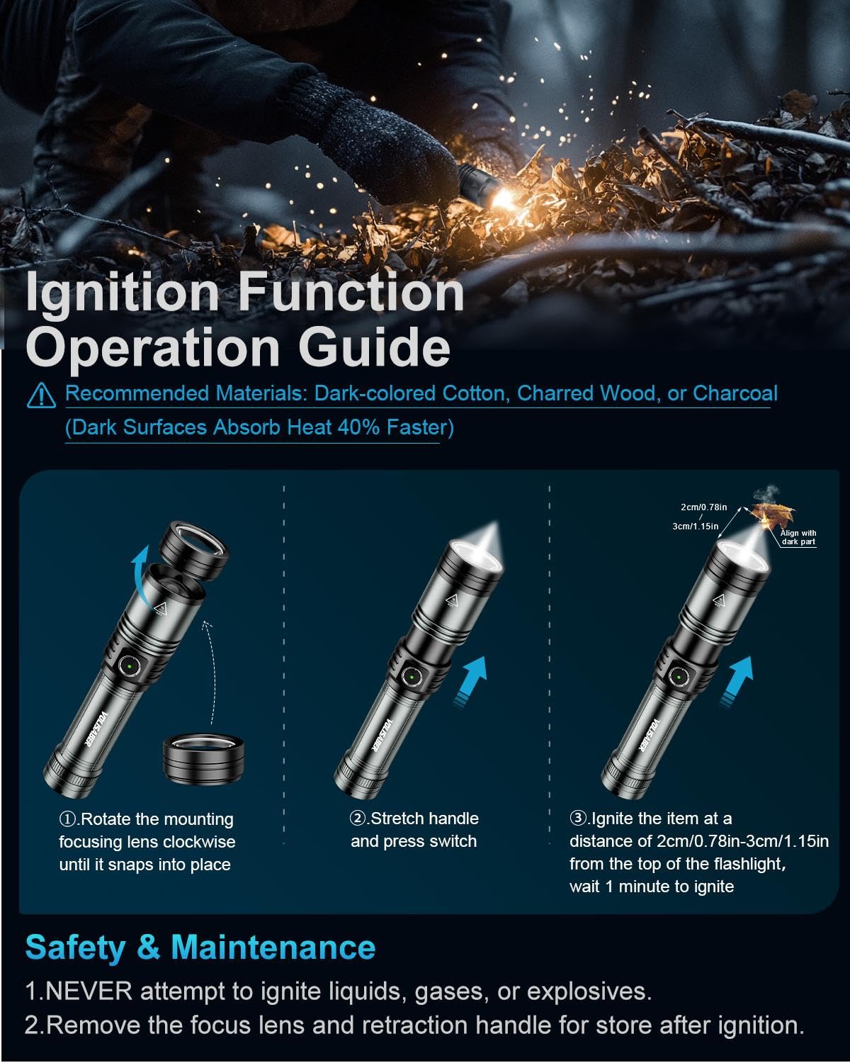 VOLISABER 1500 Lumen Tactical Flashlight - Ultimate Survival Flashlight with Fire Starter, Military-Grade Durability & Rechargeable Power Engineered for extreme adventures and emergency preparedness, this professional-grade tactical flashlight delivers unmatched illumination and survival functionality. Perfect for camping, search operations, storm preparedness, and wilderness survival scenarios. Prime-optimized Features: 1. Survival Flashlight with Fire-Starting Lens Deploy the patented parabolic ignition lens to concentrate light into a 1,200F hotspot - ignite tinder instantly without matches. Essential for emergency fire-making, wilderness cooking, and off-grid survival situations. 2. 1500 Lumen Zoomable Tactical Flashlight Dominate darkness with military-grade brightness: Zoom from intense 3280-ft spotlight to wide 120 floodlight. Ideal flashlight for search & rescue operations, tactical missions, and securing large properties during power outages. 3. Indestructible Military Flashlight Build Aerospace-grade aluminum body withstands 10-ft drops, IPX6 waterproofing (-20F to 140F operational range), and hurricane-force conditions. Built to survive job site abuse, mountain expeditions, and disaster scenarios. 4. Tactical Defense Flashlight System Instant-access strobe/SOS modes + Turbo disorientation setting. Reinforced strike bezel breaks glass and deters threats. Anti-roll hexagonal design ensures stability in crisis situations. Why Amazon Shoppers Choose This Flashlight: Most popular in Tactical Flashlights (Outdoor Gear) 2X Brighter Than Standard Survival Flashlights Backed by 10-Year Durability Guarantee Includes Fire Starter Lens & Survival Guide Trusted by Prepper Communities & SWAT Teams Perfect Multi-Use Flashlight For: Emergency Kits (FEMA Recommended) Backcountry Camping/Hunting Hurricane & Blackout Preparedness Security Professionals & First Responders Off-Grid Homestead Survival Gear