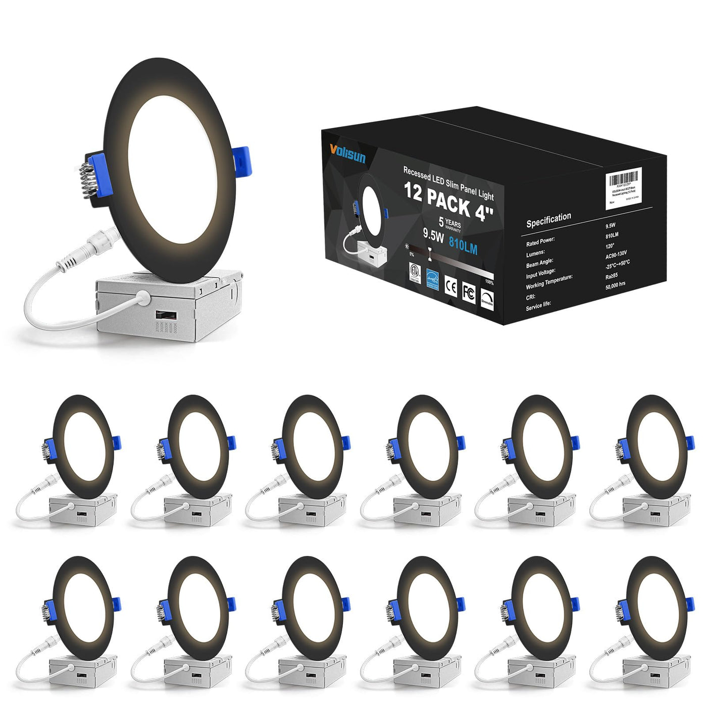 Volisun 12 Pack 4 Inch Recessed Lighting, 5Cct Led Recessed Light Black, 2700K-5000K Selectable, 9.5W Eqv 80W, 810Lm Dimmable Ca