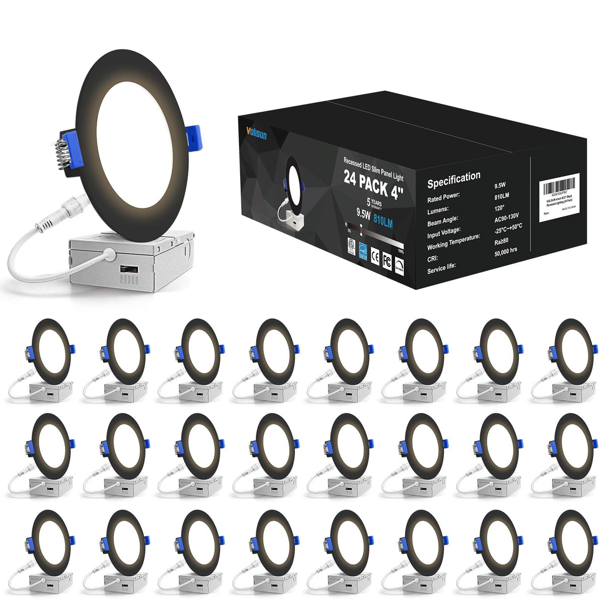 VOLISUN 4 Black Recessed Lighting 24 Pack, 5CCT LED Dimmable Wafer Downlight, 2700K-5000K, 810LM,