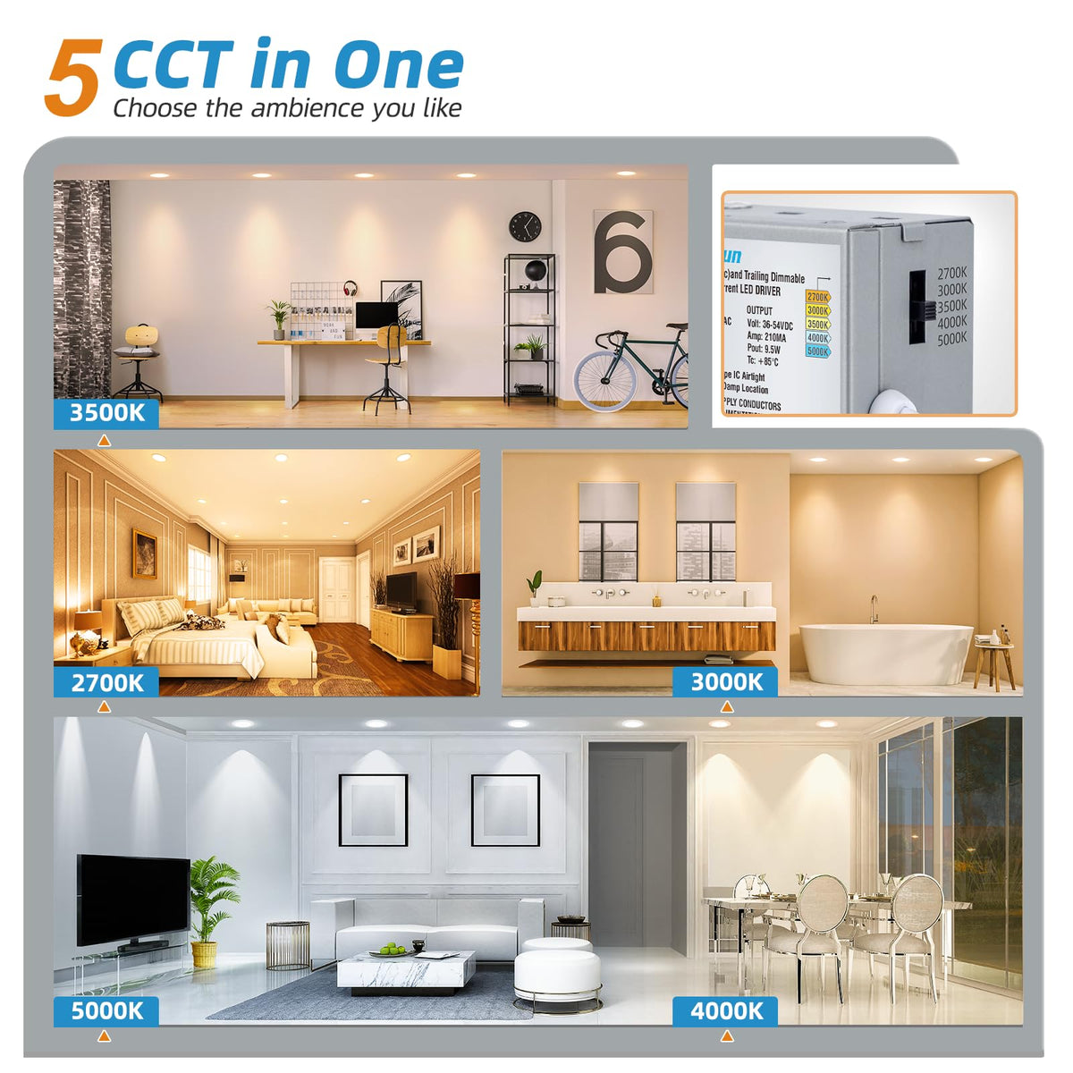 Q: What are the color temperature options available for the VOLISUN 4 inch recessed lights?A: The VOLISUN 4 inch recessed lights offer 5 selectable color temperatures: 2700K, 3000K, 3500K, 4000K, and 5000K. This feature allows you to easily customize the lighting to match your mood or the ambiance of your space.