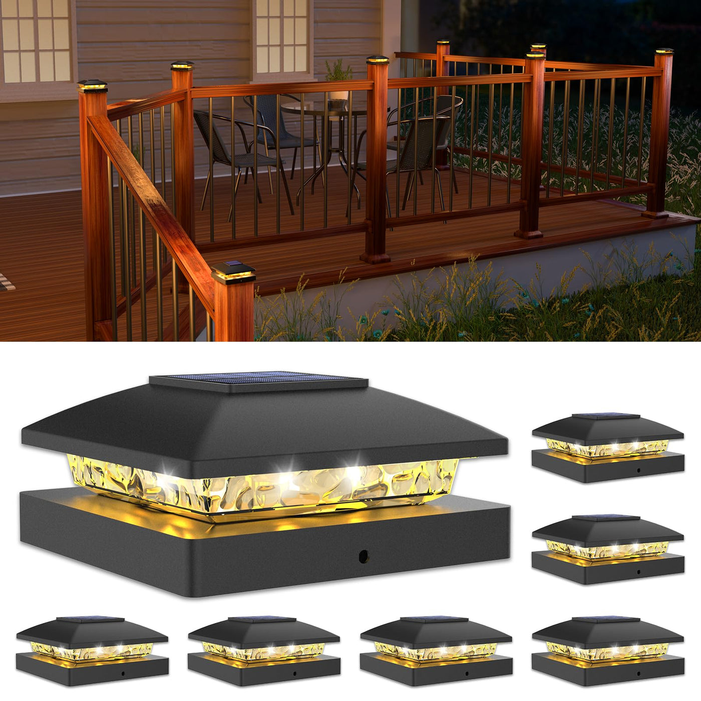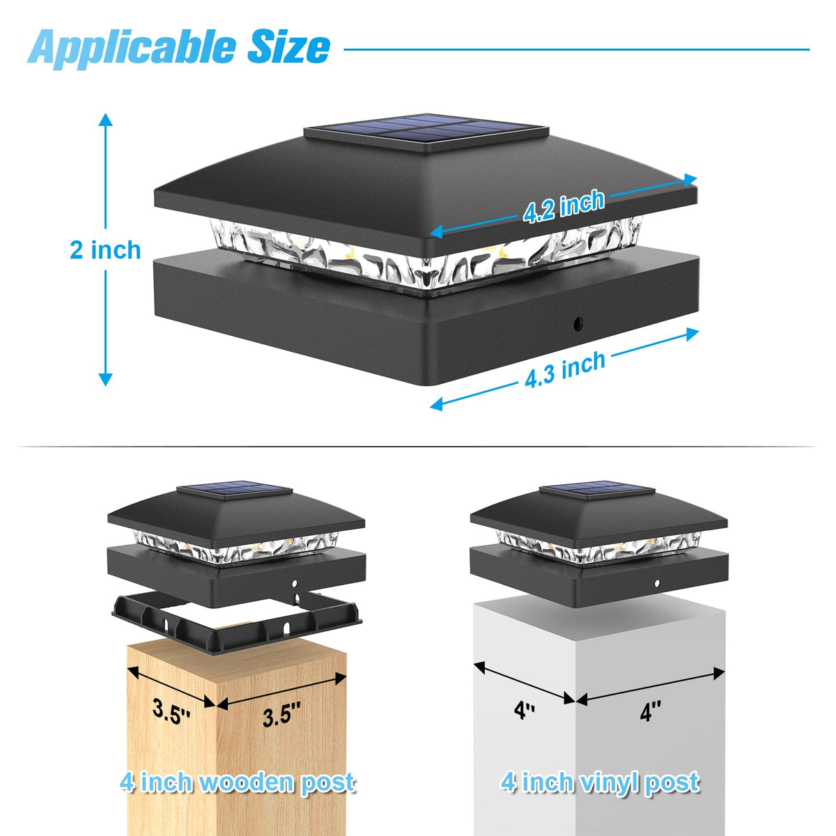 Q: How easy is it to install the solar post cap lights?A: Installation is straightforward; each package includes two bases (for wooden and vinyl posts) and 12 screws. Simply select the right base for your post size and secure it in place using the provided screws.