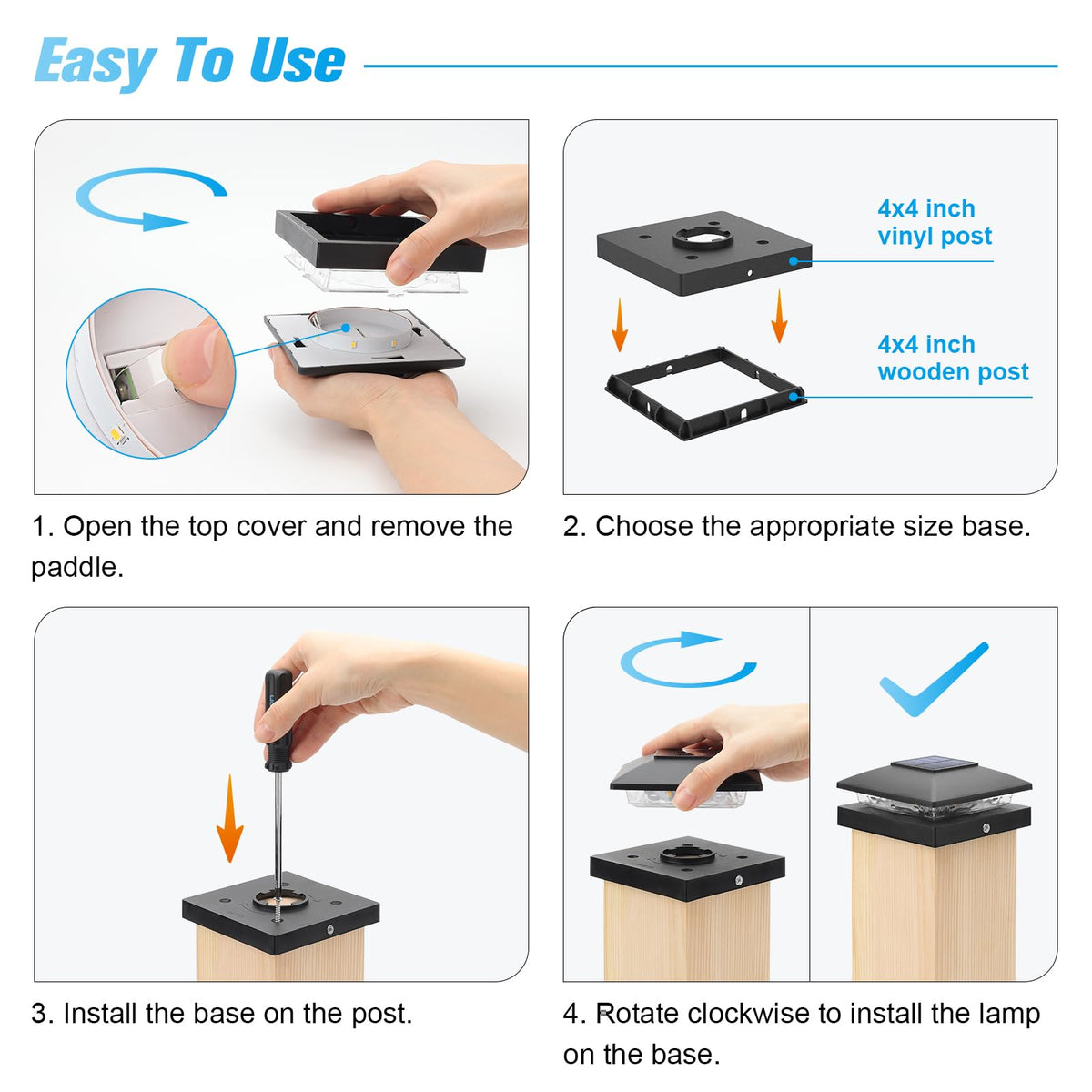 Q: What is the installation process for the VOLISUN Solar Post Cap Light?A: Installation is straightforward. Each package includes two bases for 4x4 wooden and vinyl posts, along with 12 screws. Simply select the appropriate base, attach it to your post, and secure it with screws. The light charges in sunlight for 6-8 hours and operates for 10-12 hours at night.