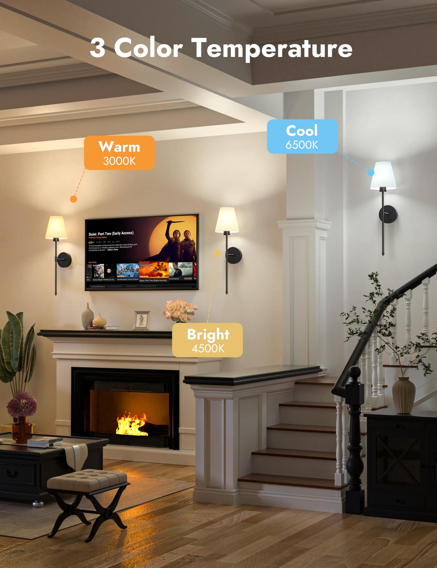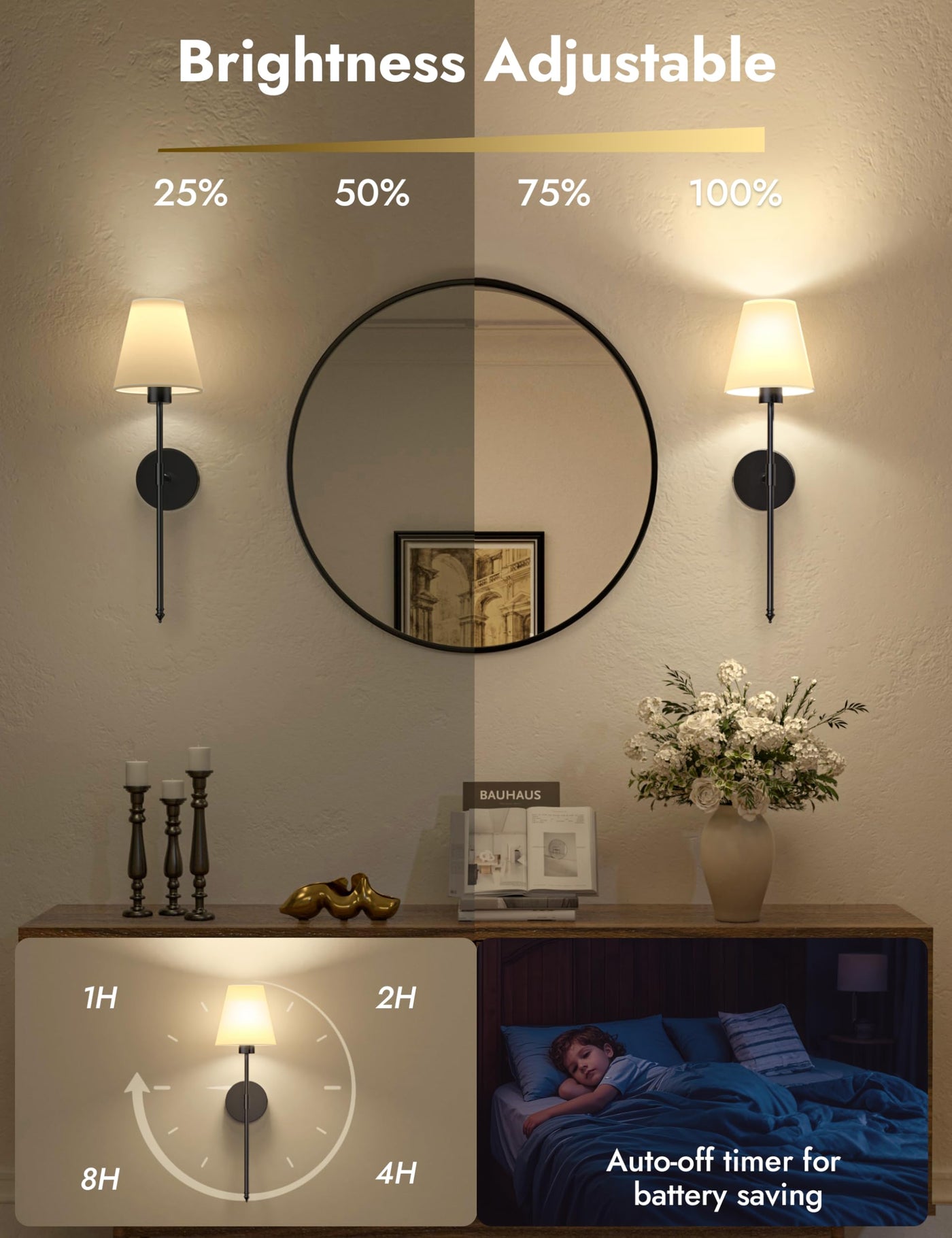 VOLISUN Battery Operated Wall Sconce Set of 2,Black Rechargeable Wall Lights with 5200mAh Dimmable Detachable Bulbs,10 Colors Wireless Sconces for Bedroom Living Room Hallway