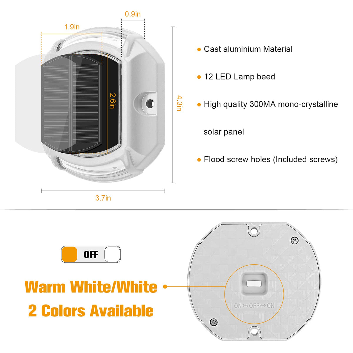 Volisun Is Committed To Led Lighting Design. This 2Color Solar Deck Lights Suitable For Various Places, Such As Patio, Garden, Driveway, Pathway, Walkway, Dock, Stairs...... Specification: Solar Panel: Monocrystalline Silicon Material: Cast Aluminium Led Type: Floodlight Waterproof Rate: Ip67 Led Color:White +Blue Led Power: 3W Lumen: 400-500Lm Battery Type: Solar Energy Battery: 1.2V/600Mah Aaa Ni-Mh High Temperature Resistant Battery Working Temperature: -20?-70? Package Includes: 16 X Solar Dock Light 16 X Screw Sets 16X Double-Sided Tape 1 X User Manual Cautions: For The First Use, Please Turn On The Bottom Button; Exposing The Led Light Under The Sun For 8 Hours To Ensure The Light Long Lifetime.
