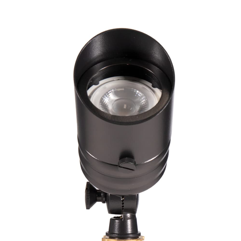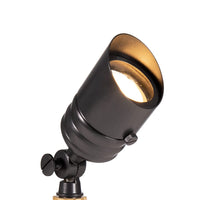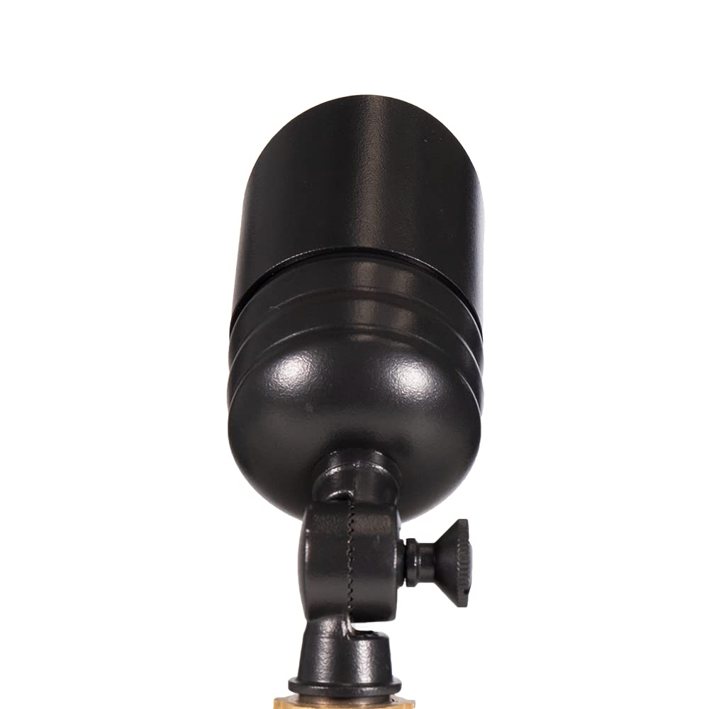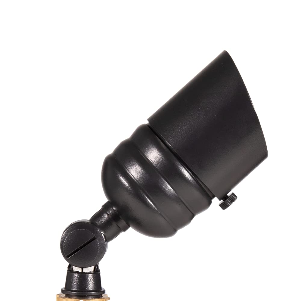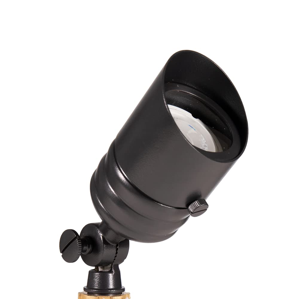 This compact version of our best-selling and most affordable spotlight features a slimmer and shortened body so it can be more easily concealed in your landscape, but still uses an MR16 bulb - so it produces the same light output as the original Fat Boy. Constructed of solid brass with a black powder coat finish for a lifetime of durability. Features a 360-degree rotatable glare guard and adjustable knuckle for precision aiming of light output. The fixture body pressure-fits onto an O-ring for the ultimate moisture tight design. The ceramic high-temperature socket is pre-greased for smooth operation, moisture protection and longevity. A silicone plug where the 4-foot lead wires exit the fixture prevents ground moisture from entering. The raised glass lens is designed for water shedding and drainage. The included 5W MR16 38-degree LED bulb produces 400 lumens of 2700K (warm white) light. Our patented 10-inch heavy-duty PVC Hammer Stake is also included for easy installation and mounting stability. UL & cUL Listed and backed by our lifetime warranty.