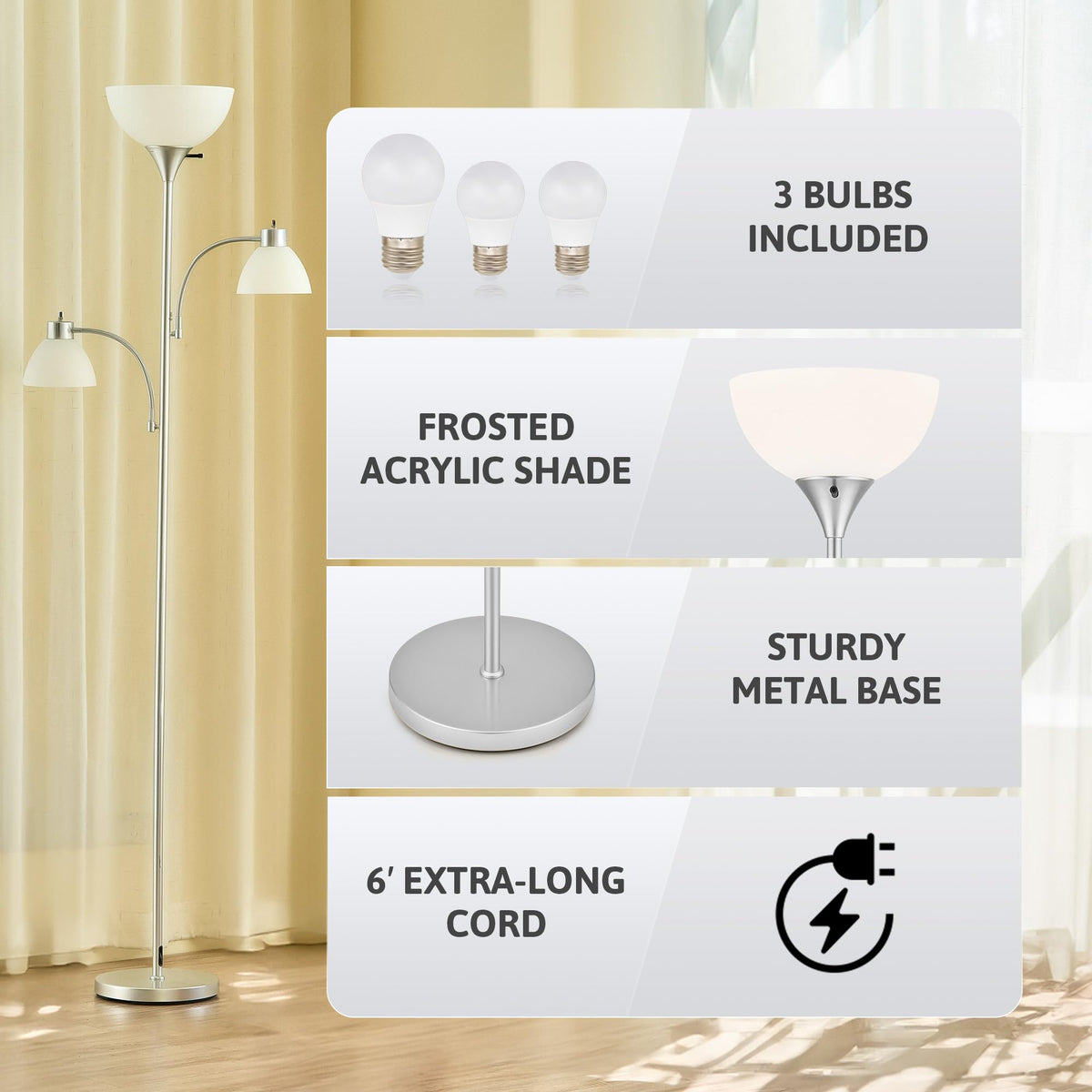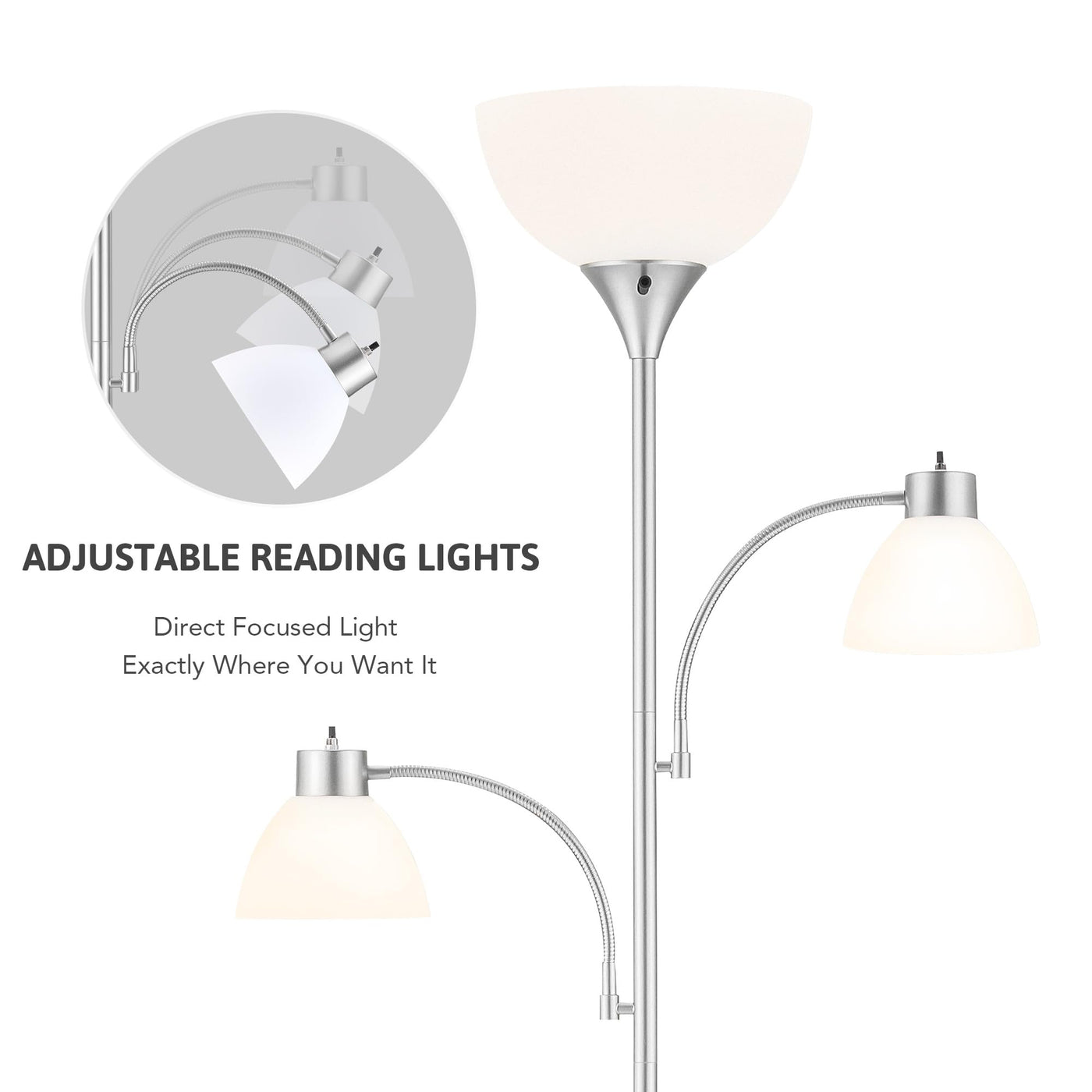 Whether You Want To Brighten Up A Corner Or Add A Practical Decorative Piece To Your Living Space, Vonluce'S 71'' Torchiere Floor Lamp Has You Covered. Its Sleek, Slender Profile Stands Tall Without Taking Up Too Much Surface Space, Making It Ideal For Living Rooms, Bedrooms, Or Home Offices. The Main Torchiere Casts Soft, Ambient Light, While The Flexible Goosenecks On The Reading Lamps Put Light Exactly Where You Need It. With Three Adjustable Color Temperatures And Individual Switches, You?E In Full Control Of Creating The Perfect Lighting For Any Moment! Specifications Materials: Metal, Acrylic Color: Nickel, White Number Of Lights: 3 Bulb Type: E26 Max. Wattage: 60W Switch Type: Rotary Color Temperature Range: 3000K-5500K (3 Levels) Overall Height: 71.3 In. (181 Cm) Main Shade Size: 9.8 X 4.6 In. (25X11.7 Cm) Small Shade Size: 5.9 X 3.7 In. (15X9.5 Cm) Base Diameter: 9.8 In. (25 Cm) Power Cord: 6 Ft. (1.8 M) Base Weight: 6.2 Lb. (2.8 Kg) Total Weight: 9.5 Lb. (4.3 Kg) Package List 1X Floor Lamp 1X 9W Led Bulb 2X 5W Led Bulbs 1X Instructions