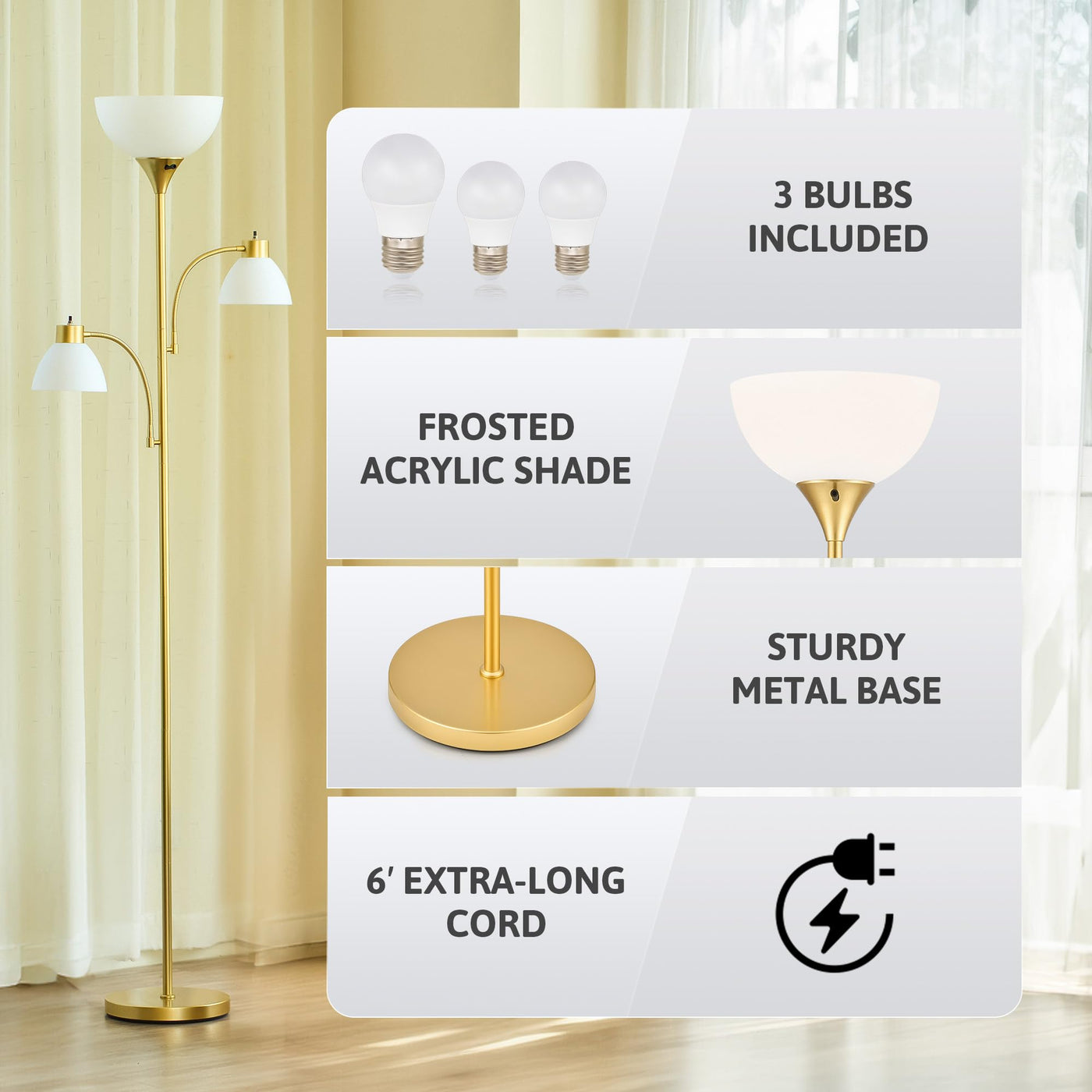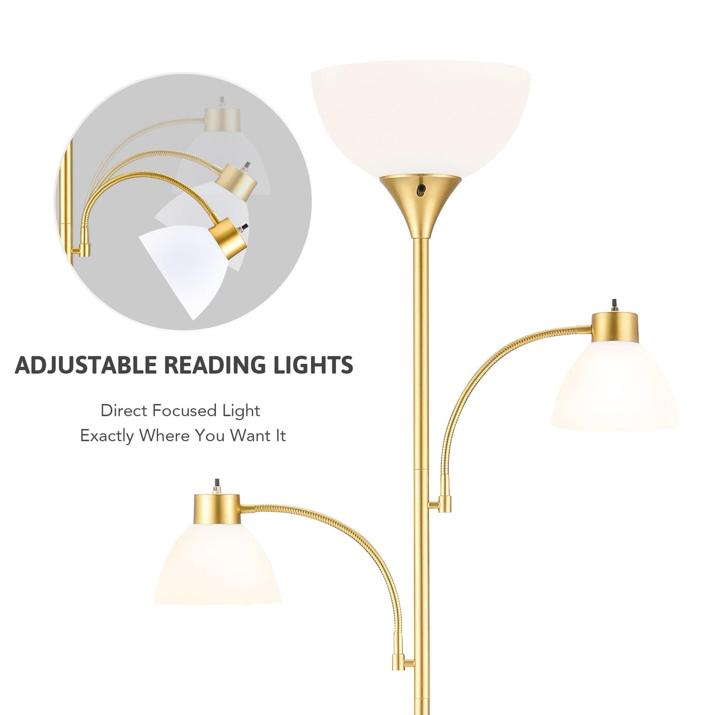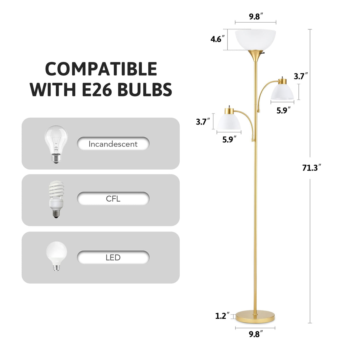 Whether You Want To Brighten Up A Corner Or Add A Practical Decorative Piece To Your Living Space, Vonluce'S 71'' Torchiere Floor Lamp Has You Covered. Its Sleek, Slender Profile Stands Tall Without Taking Up Too Much Surface Space, Making It Ideal For Living Rooms, Bedrooms, Or Home Offices. The Main Torchiere Casts Soft, Ambient Light, While The Flexible Goosenecks On The Reading Lamps Put Light Exactly Where You Need It. With Three Adjustable Color Temperatures And Individual Switches, You?E In Full Control Of Creating The Perfect Lighting For Any Moment! Specifications Materials: Metal, Acrylic Color: Gold, White Number Of Lights: 3 Bulb Type: E26 Max. Wattage: 60W Switch Type: Rotary Color Temperature Range: 3000K-5500K (3 Levels) Overall Height: 71.3 In. (181 Cm) Main Shade Size: 9.8 X 4.6 In. (25X11.7 Cm) Small Shade Size: 5.9 X 3.7 In. (15X9.5 Cm) Base Diameter: 9.8 In. (25 Cm) Power Cord: 6 Ft. (1.8 M) Base Weight: 6.2 Lb. (2.8 Kg) Total Weight: 9.5 Lb. (4.3 Kg) Package List 1X Floor Lamp 1X 9W Led Bulb 2X 5W Led Bulbs 1X Instructions
