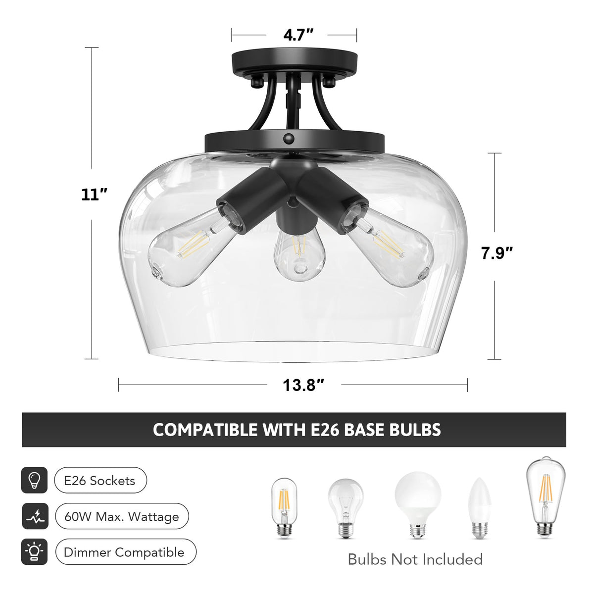 Q: Does the ceiling light come with bulbs included?A: No, the VONLUCE Semi Flush Mount Ceiling Light does not include bulbs; you will need to purchase E26 base bulbs separately.