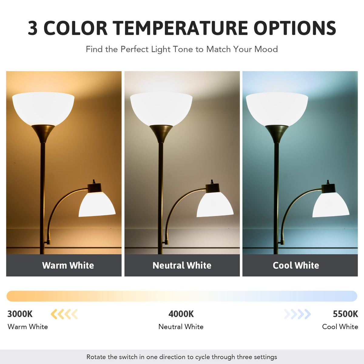 Q: How do I switch between color temperatures on this lamp?A: Each light on the VONLUCE Torchiere Floor Lamp has its own rotary switch that allows you to cycle through three color temperatures (3000K-5500K), giving you the flexibility to create the desired ambiance.