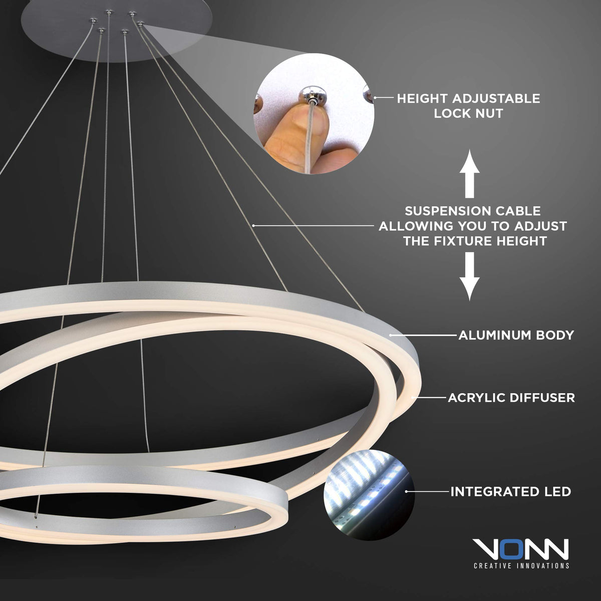 Q: What are the dimensions of the VONN VMC32500BL Tania Trio chandelier?A: The dimensions of the VONN VMC32500BL Tania Trio chandelier are 31.50 inches in length, 31.50 inches in width, and it has an adjustable height of up to 120 inches, with a minimum height of 16.5 inches.