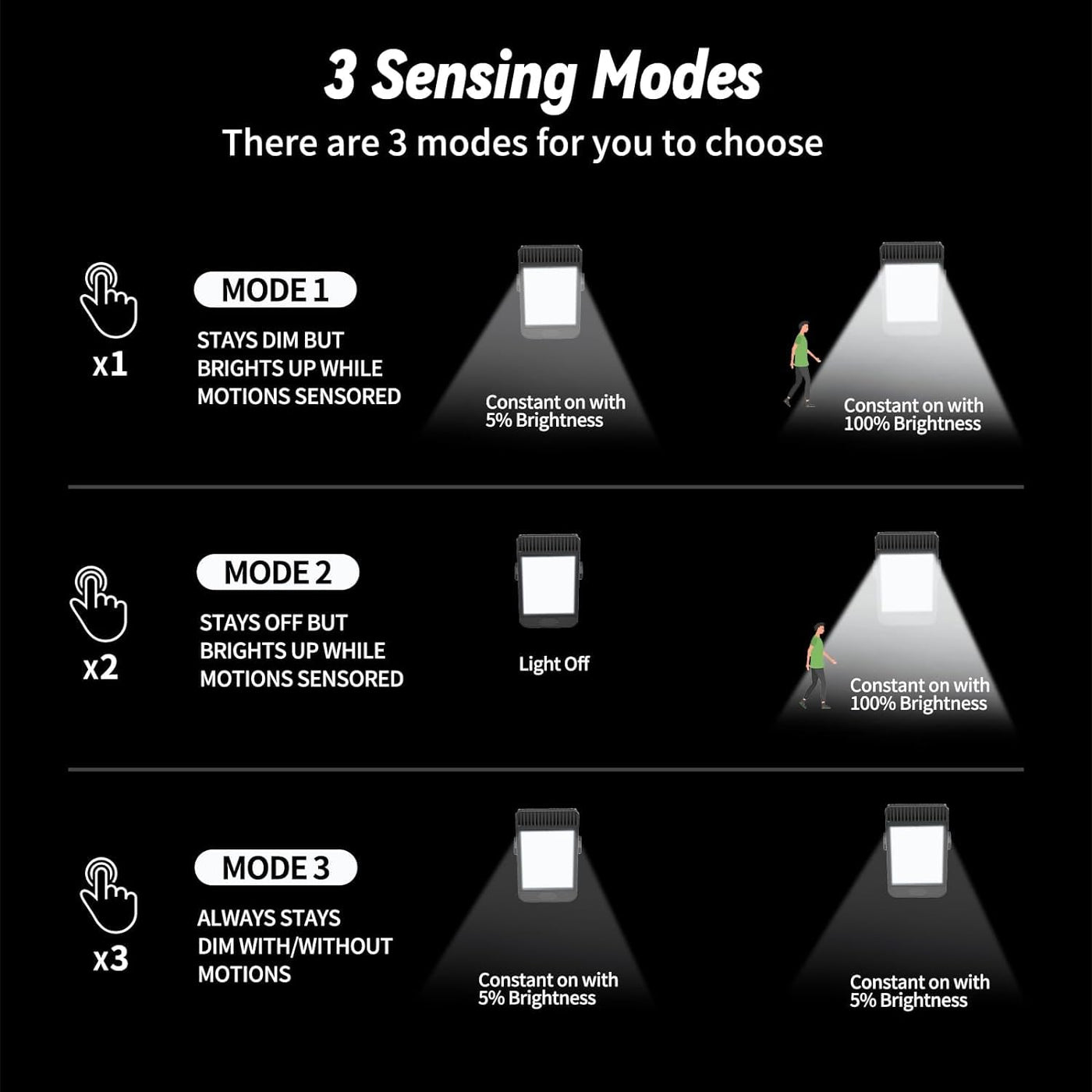 Q: What are the different lighting modes available on these solar lights?A: The Voominhtec solar lights have three smart light modes: 1. Dim mode that brightens when motion is detected, 2. Off mode that lights up on motion detection, and 3. Constantly on dim mode, allowing you to choose the best setting for your needs.