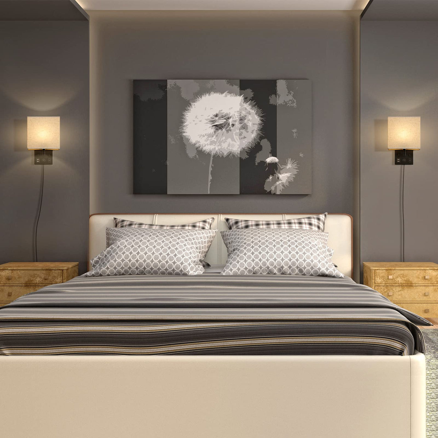 Dual USB ports: The desk lamp includes 2 high-quality USB charging ports (5V/2.1A) for charging mobile phones, tablets, and laptops. It's very convenient, placed above the light panel, at a glance, and saves you time looking for ports for minor changes that aren't easy to spot. 2-pin AC power socket: Equipped with an AC socket with a maximum power of 800W, which meets the charging needs of general small electronic devices. It is not only suitable for the bedside and bedroom, no additional sockets are required whether you are working or sleeping. Add more convenience to your life. Convenient rocker switch: as long as the power cord socket is plugged in, whether the arm light is turned on or not, the USB and AC socket functions can be used; the lamp is controlled by the rocker switch. Specification: Color: Black Style: Modern Material: Fabric + Metal Size: 11.81*7.87*5.31inch Package Including: 2 * Wall Lamp 2* Bulb 1* installation manual