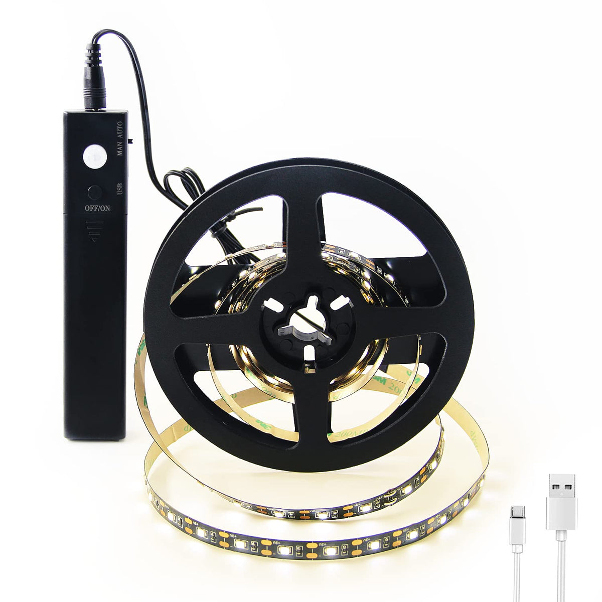 Q: How does the motion sensor feature work on this LED tape light?A: The motion sensor on the VST LED Strip Light has two modes: 'Auto' mode, which activates the light when motion is detected up to a distance of two and a half meters, and 'Man' mode, which requires manual operation using the 'ON/OFF' button.