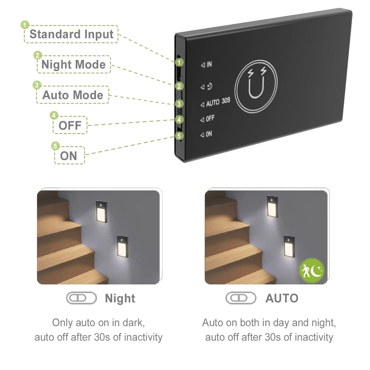 Q: What are the different modes available for the VST Motion Sensor Night Light?A: The VST Motion Sensor Night Light features four modes: ON, OFF, Auto Mode, and Night Mode. In Auto Mode, the light turns on automatically both day and night and turns off after 30 seconds of inactivity. Night Mode activates in the dark and also shuts off after 30 seconds, providing half the brightness of Auto Mode.