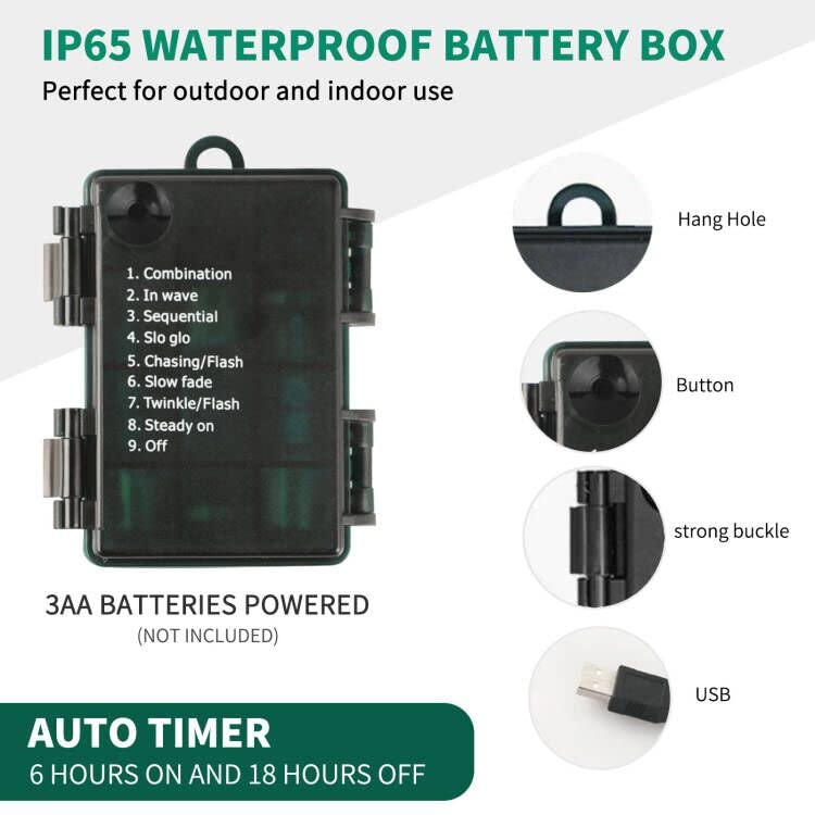 Technical Specifications: Light Color: Warm White, White, Multi-Color Application: Indoor/Outdoor Led Quantity: 100 Led String Length: 33Ft / 10M Work Mode: 8 Lighting Modes Waterproof Rate: Ip65