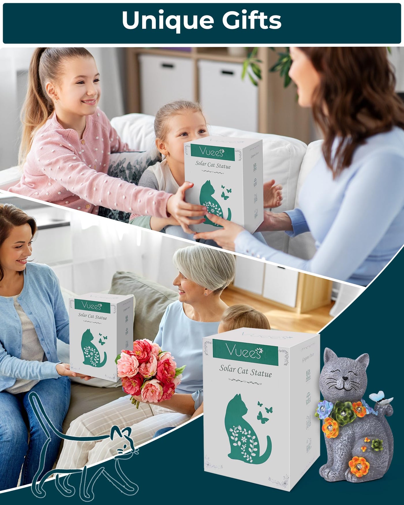 Q: How does the Vuees Solar Cat Statue work?A: The Vuees Solar Cat Statue operates using solar power. It features a solar panel that absorbs sunlight during the day and automatically illuminates at night, creating a beautiful display in your garden or outdoor space.