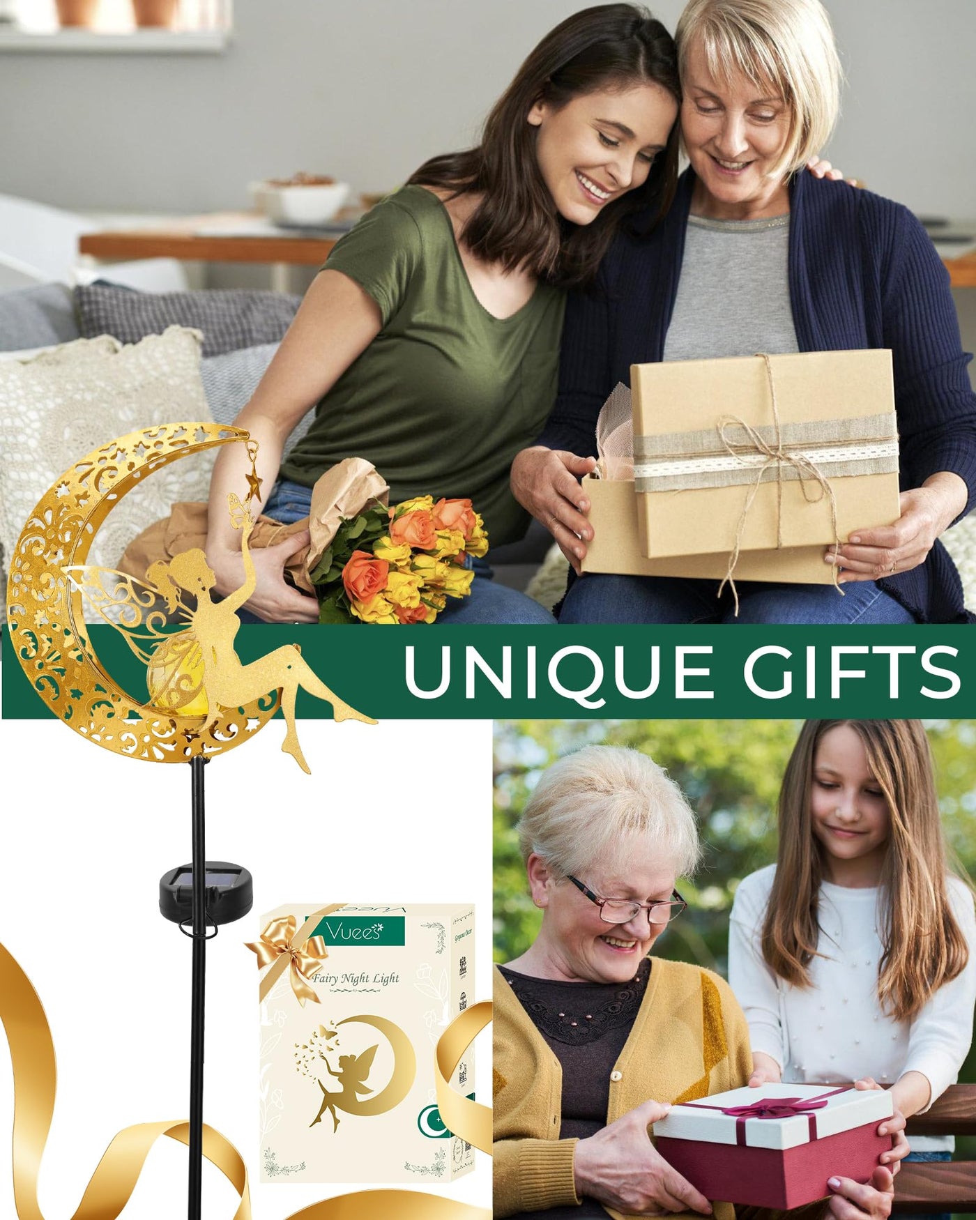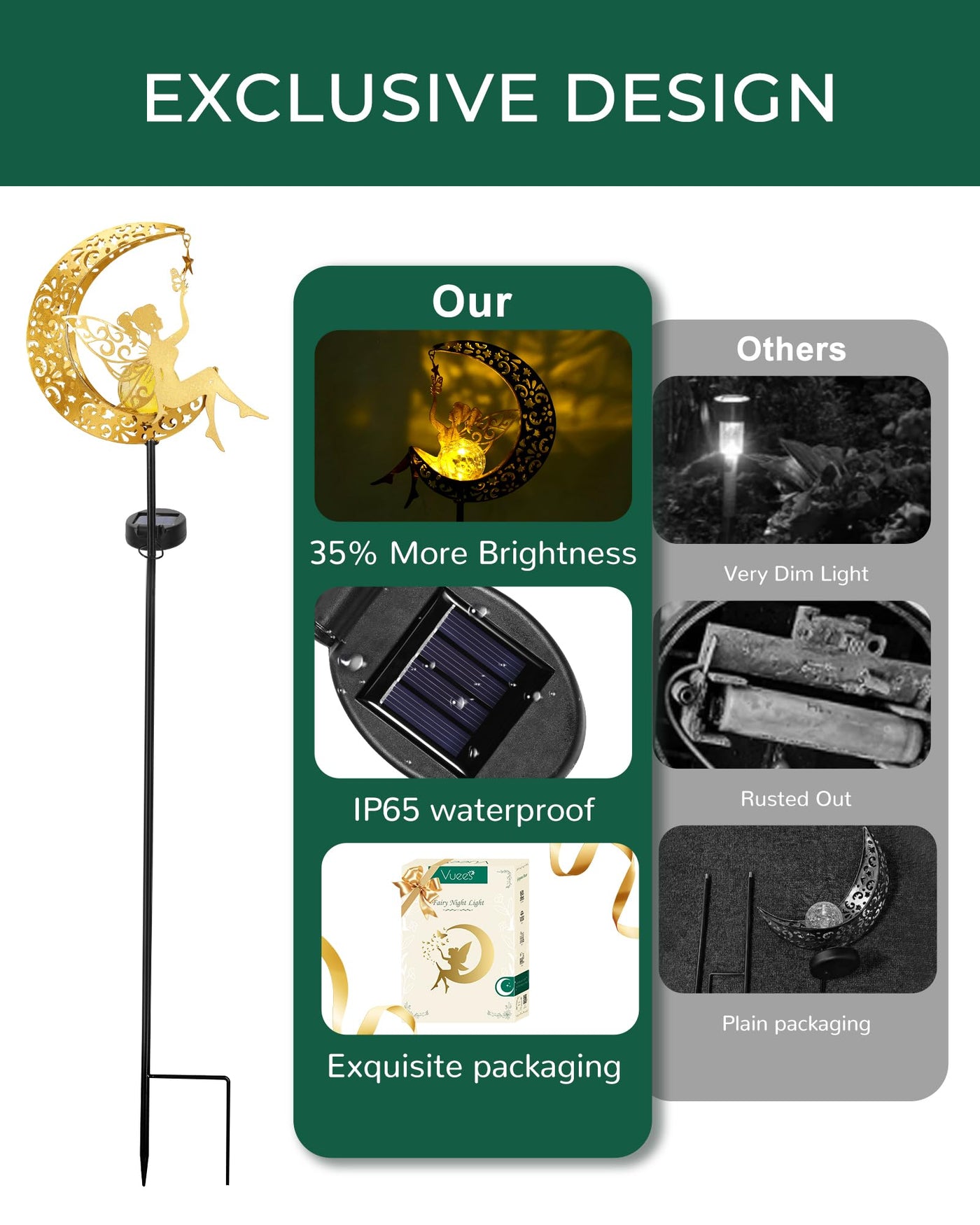 Q: What types of decorations do the solar garden stakes feature?A: The solar garden stakes by Vuees are uniquely designed with themes of fairy, moon, butterfly, and star. When illuminated, they showcase warm white LED lights that create beautiful reflections, enhancing the visual appeal of your outdoor space, including gardens, lawns, and patios.