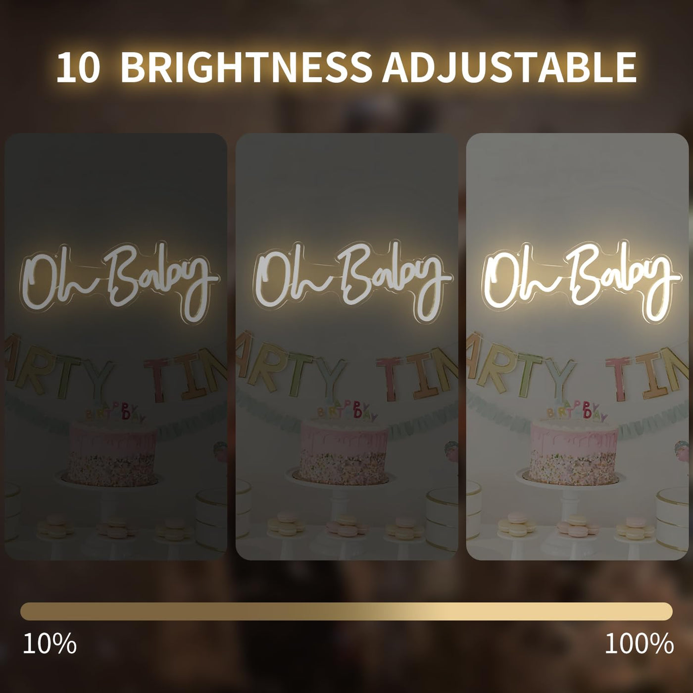 The oh baby led sign at your baby show, wedding, birthday party can convey a bright and cheerful message, creating a suitable emotional atmosphere for your important events; Oh baby sign for backdrop measures 42 x 18 cm (16.5 x 7 in), USB cable length is 180 cm (71 in) and baby neon light is made of transparent acrylic and flexible LED neon strips not easily damaged; Oh baby light up sign has 10 levels of adjustable brightness