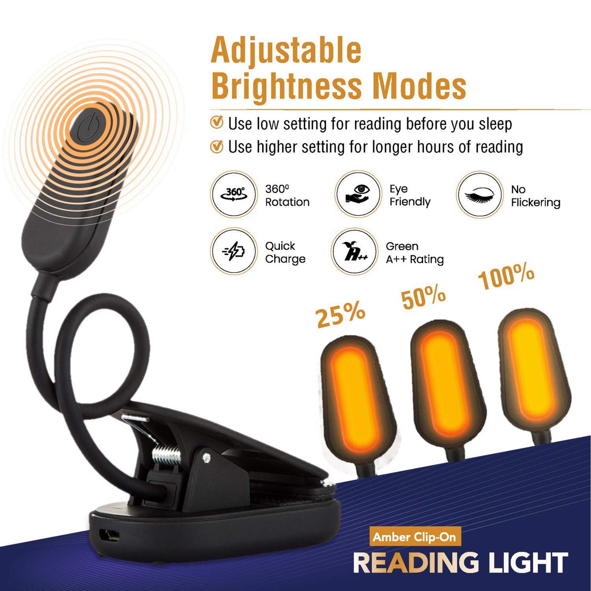 Are you worried about bothering your spouse when you read at night or unable to sleep after reading under white light? VYANLIGHT presents you with a single solution to both your problems! Our portable reading lights are designed to give you all the luminescence youll need for day-to-day tasks without hurting, straining, or stressing your eyes. It filters 99.95% of blue light and emits gentle and sweet amber tone light to bring you the greatest reading experience in bed. Moreover, it helps your body to produce more melatonin which can make you feel relaxed and have a sweet dream! * 1600K warm LEDs for reading on the bed * 360-degree rotating gooseneck * Anti-flicker and eye-friendly * Adjustable brightness (3 levels) * 1200mAh rechargeable battery * Included micro-USB cable for quick charging