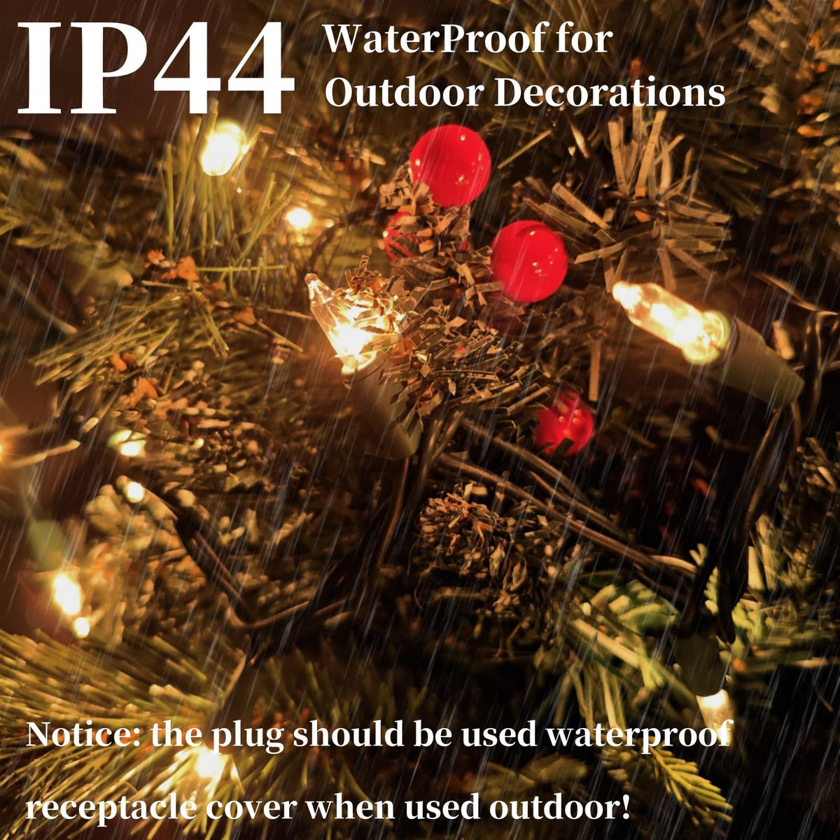 Constructed with well-made materials, these lights feature a durable 21-foot green wire strand that holds 100 clear mini bulbs. The design is engineered for safety and longevity, ensuring reliable performance in various weather conditions. With an IP44 waterproof rating, these lights can withstand rain, snow, and humidity, making them suitable for extended outdoor displays. The set includes a 19.6-inch lead wire and a 4-inch end connector for easy linking, allowing you to create stunning light arrangements in your home or yard.