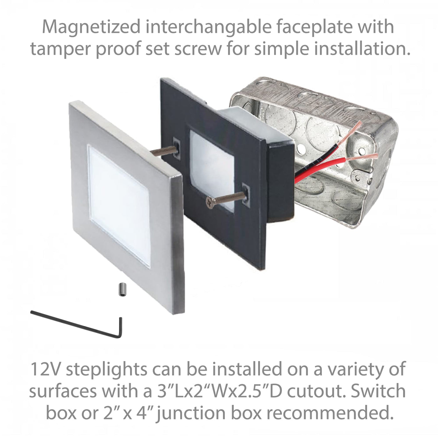 120V step and wall lights by WAC Lighting are offered in a variety of styles and can be installed onto a standard 2in x 4in electrical junction box. These luminaires offer enhanced energy efficient functionality and optimized light output to adequately illuminate stairs, walls and walkways with little or no glare and are perfect for indoor or outdoor applications. | Factory sealed water tight and IP66 rated for protection against high-pressure water jets and outdoor elements. | Casted using a special k-alloy aluminum that is engineered to withstand the most challenging environments over time. Stainless steel (-SS) or solid brass coated in bronze (-BBR) finishes are available for enhanced protection against corrosive elements and is recommended for use in coastal or marine environments. | Available in 3000K warm white, 2700K warm, amber warm, blue, and red LED color temperatures - order accordingly. Amber color temperature is turtle friendly. Special daylight photocell sensor option is available that turns the steplight on at dusk and off at dawn automatically, SKU # WL-LED102 and WL-LED202. Brushed Nickel finishes are only for interior use. | High Powered LED, Input: 9-15V AC, Power: 2W (3VA), Brightness: up to 68Lm, CRI: 90, Rated Hours: 60,000. Smooth and continuous dimming to 10% with a Magnetic Low Voltage Dimmer. | Standards: UL & cUL 1598 and IP66 Rated for Wet Locations (See Specification Sheet for complete details). Fits into 2
