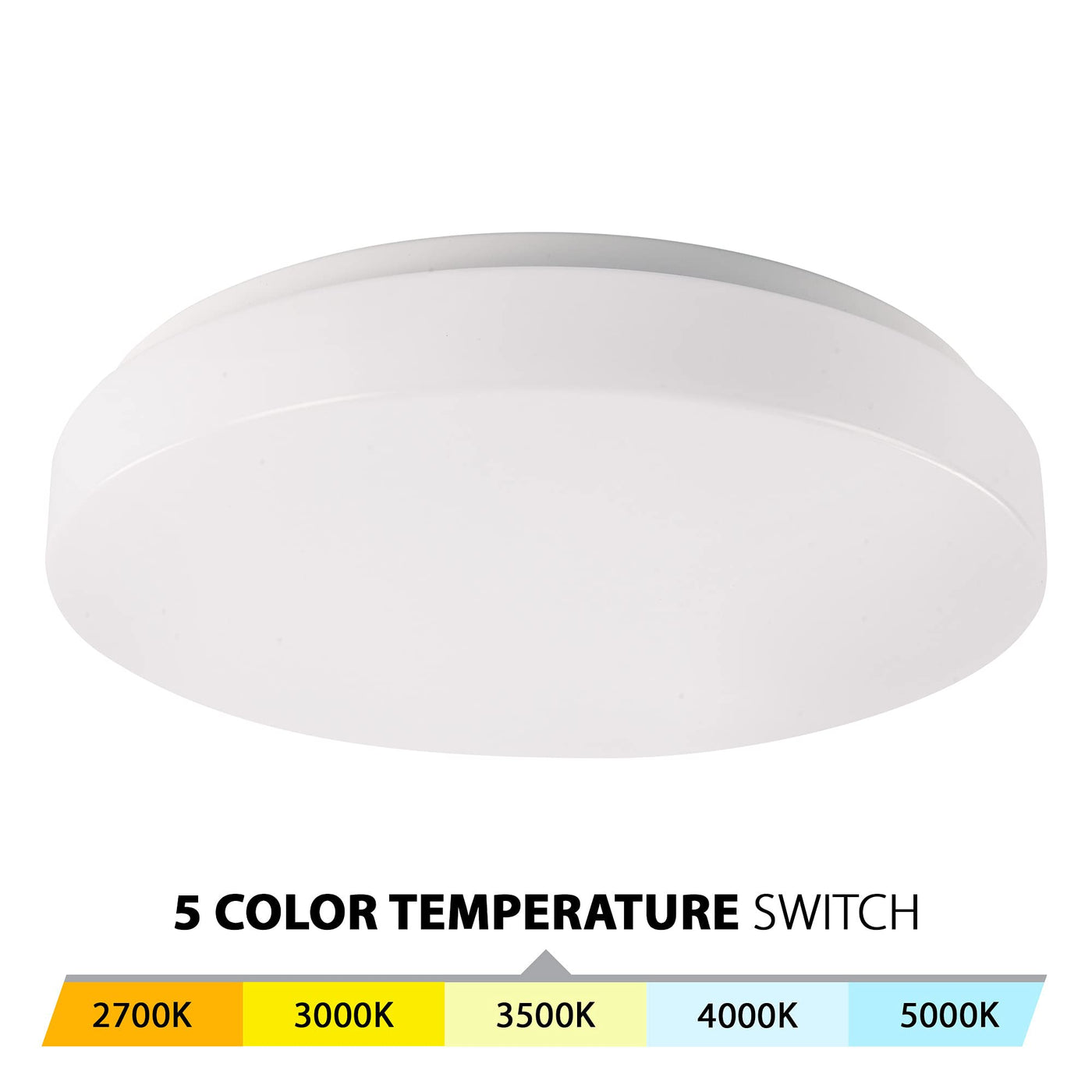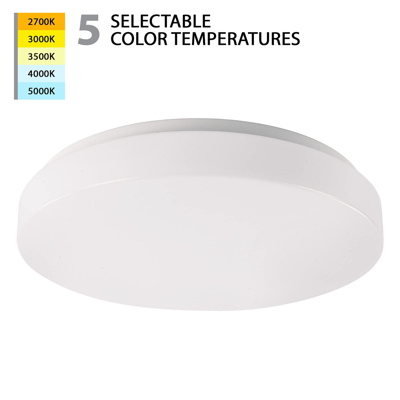 Q: What color temperatures can I select with the Blo LED Flush Mount?A: This fixture features a five-color temperature selectable switch, allowing you to choose between two thousand seven hundred Kelvin, three thousand Kelvin, three thousand five hundred Kelvin, four thousand Kelvin, and five thousand Kelvin.