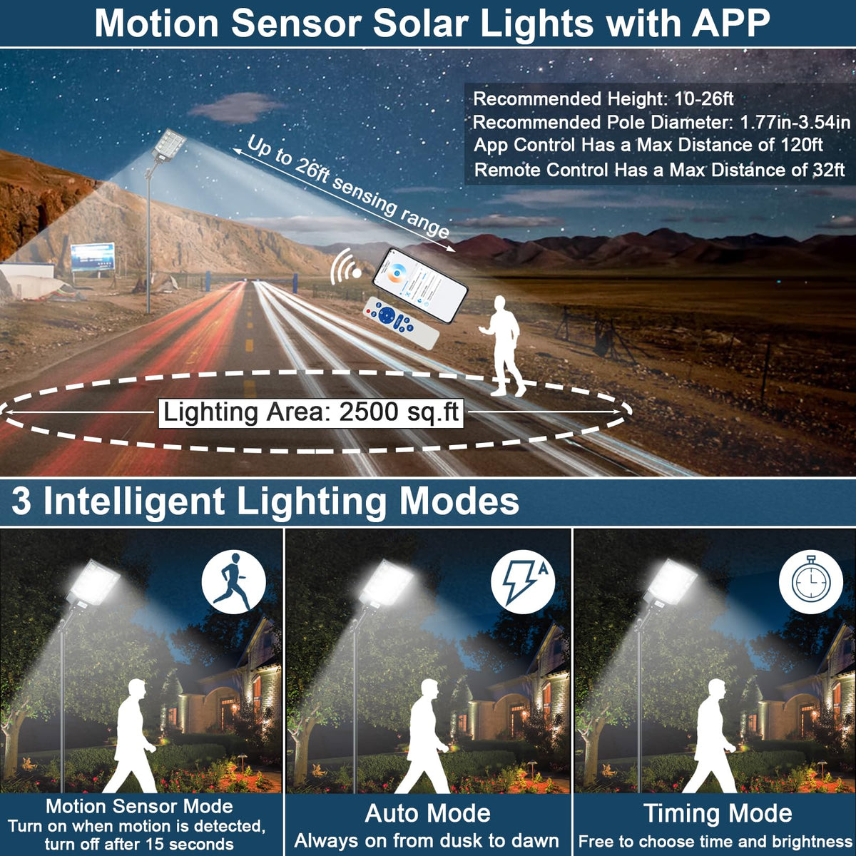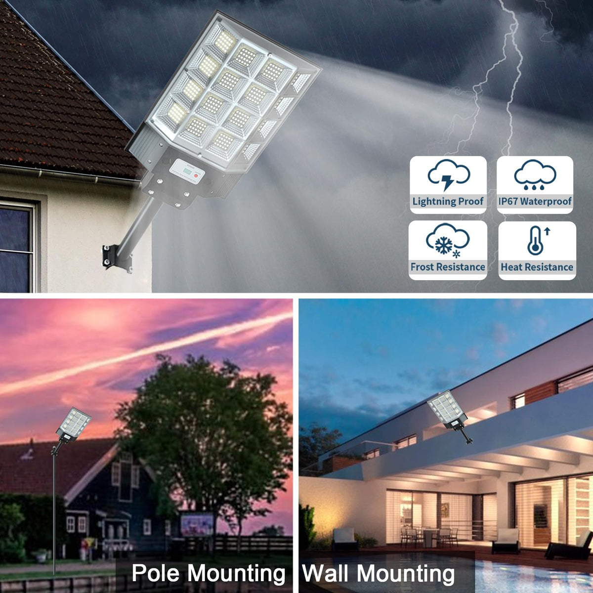 Waterproof & Durable: The solar street lights utilize a stable and long-lasting solar lithium battery, eliminating electricity bills. Made from high-quality materials, the IP67 waterproof, dustproof, sunproof, lightning-proof, and rain-proof design allows the solar lights to function effectively in the most challenging weather conditions.
