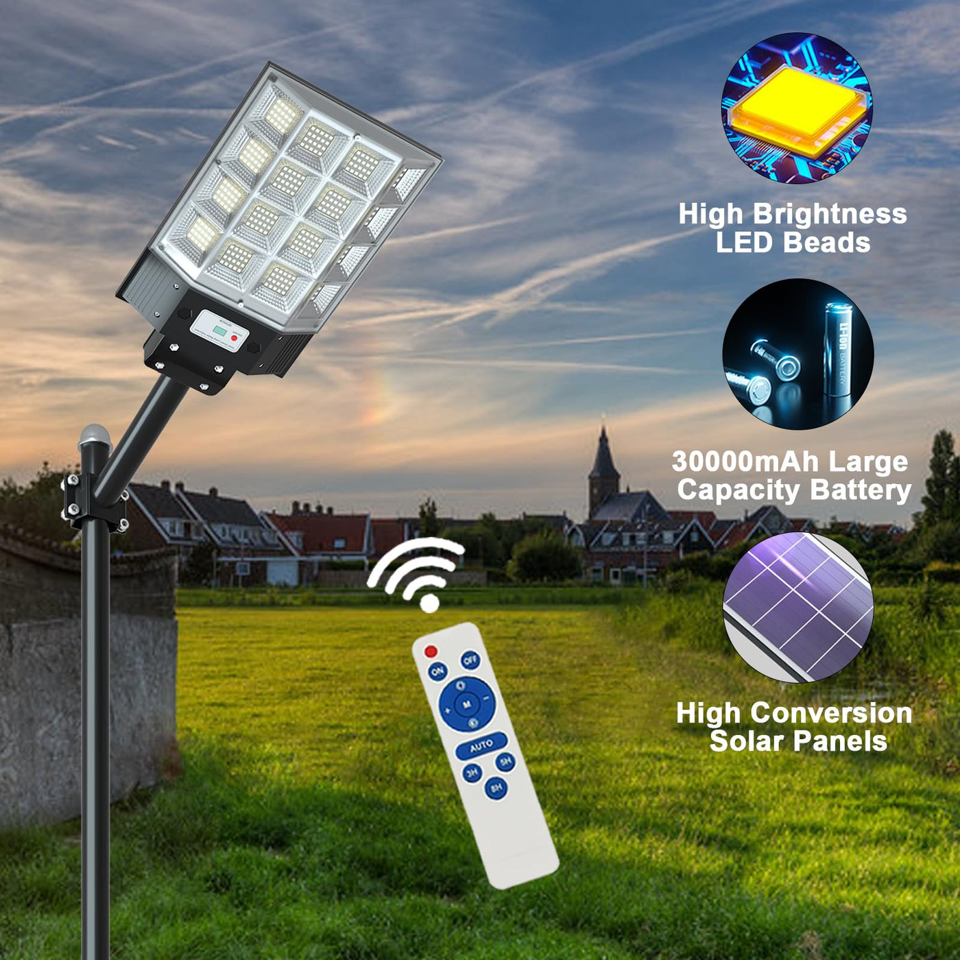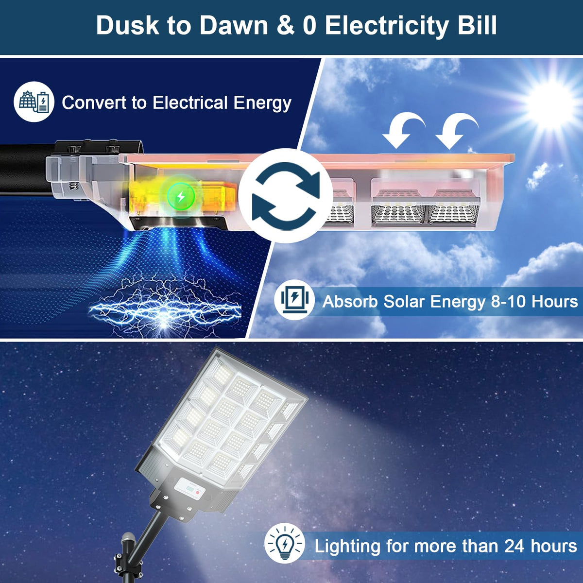 This solar street light is engineered with a 3-way large panel ultra wide-angle lighting system, offering a wider range of illumination and brighter light compared to traditional street lights. It effectively brightens dark corners and blind spots without requiring any external power, ensuring the safety of you and your family. It is the top choice for reliable night lighting.