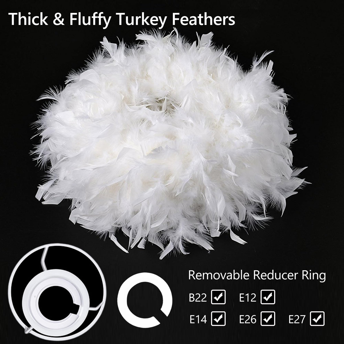 Shade Only: Bulbs and Cords are NOT included. | Suitable for Most Light Fitting: Comes with a removable reducer ring makes it suitable for most lamp sockets like E26/B22/BC E14/SES E27/ES. | Fits Most Bulbs: The bulb depends on the light fitting. Screw in or bayonet bulbs both fit. Suggest using max. 40W LED bulb are better. Please do not use tungsten lamp bulbs with excessive heat generation, as long term high heat can easily damage feathers and reduce their using lifespan. | Easy to Install: Can be hung on right out of the box. No electrical installation required. Before hanging, please shake off the loose feathers. Please install the lampshades according to the instruction, any questions with installation, please let us know. | Dimension & Weight: Inner diameter 15.7 inches. Outer diameter 19.7 inches Weight: 1.1 lb to 1.5lb.
