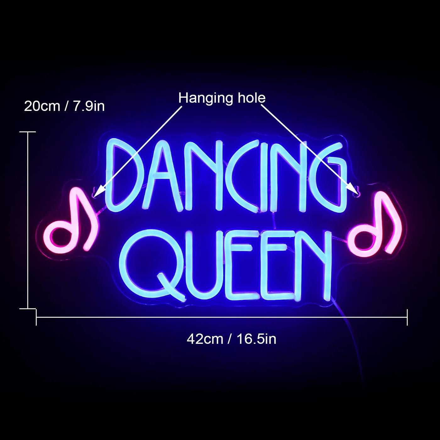 Q: What are the dimensions of the Dancing Queen Neon Sign?A: The Dancing Queen Neon Sign measures 16.5 inches in width and 7.9 inches in height, making it a perfect fit for various wall spaces.