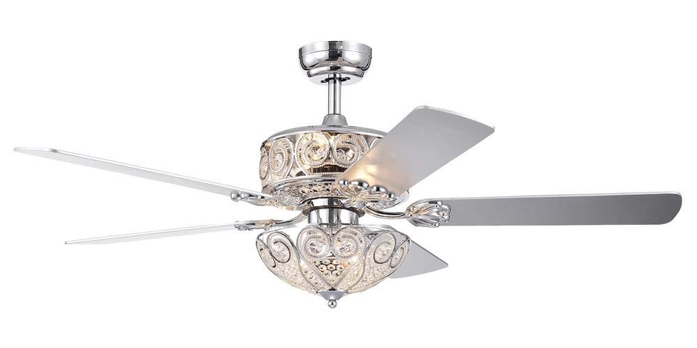 Beautiful sparkling light patterns combine with relaxing, cool air in this chandelier lighted ceiling fan. The polished chrome finish paired with lovely scroll patterned upper and lower crystal lamps delivers a glamorous addition to your home. Matching silver wooden fan blades completes the sophisticated grace of this piece.