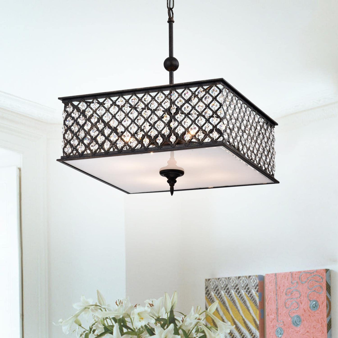 Add this 4-light chandelier to your kitchen, dinning room, living room or bedroom for an added touch of glam. This fixture features a criss cross metal shade with beautiful embedded crystals. The antique copper finish pairs beautifully with the crystals for an industrial yet sophisticated look.