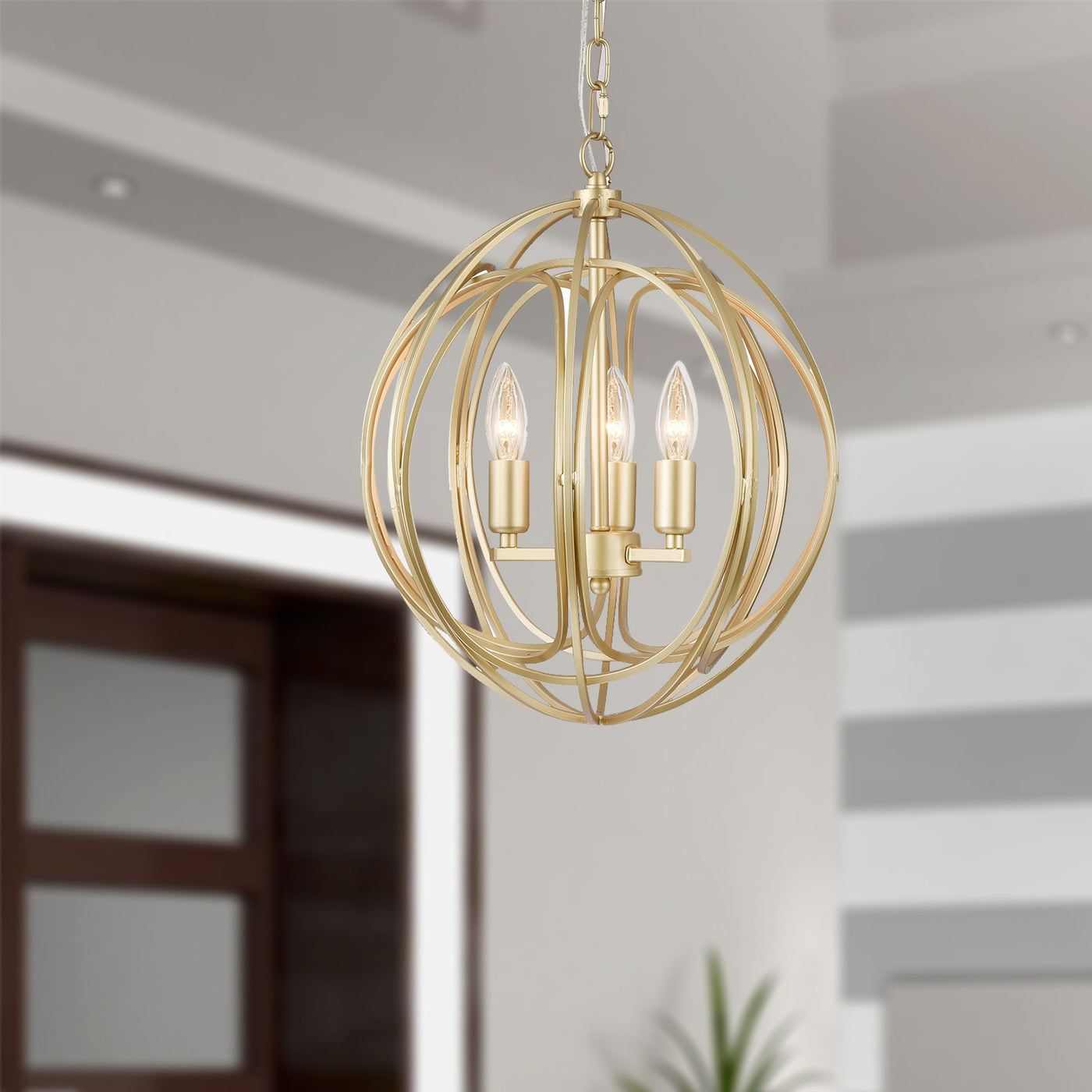 Bring an elegant atmosphere to your home with this pendant light fixture. With a globe-style cage design and a soft-brushed gold finish, this fixture has an intriguing modern look that allows unrestricted illumination from the three candelabra light bulbs. The adjustable length on this fixture allows installation on various ceilings. Lighting Type: Pendant Fixture Finish: Soft Brushed Gold Setting: Indoor Number of Lights: Three (3) Bulb Type: 40-W E12 (not included) HardwiredDimensions: Overall: D 13.8 x H 37 inches Fixture: D 13.8 x H 15 inches Canopy: D 5 x H 1 inches Chain/Wire Length: 20 inches (Adjustable)This fixture needs to be hardwired. Professional installation is recommended.This product can expose you to chemicals including Di(2-ethylhexyl)phthalate (DEHP), Lead which are known to the State of California to cause cancer and birth defects or other reproductive harm.