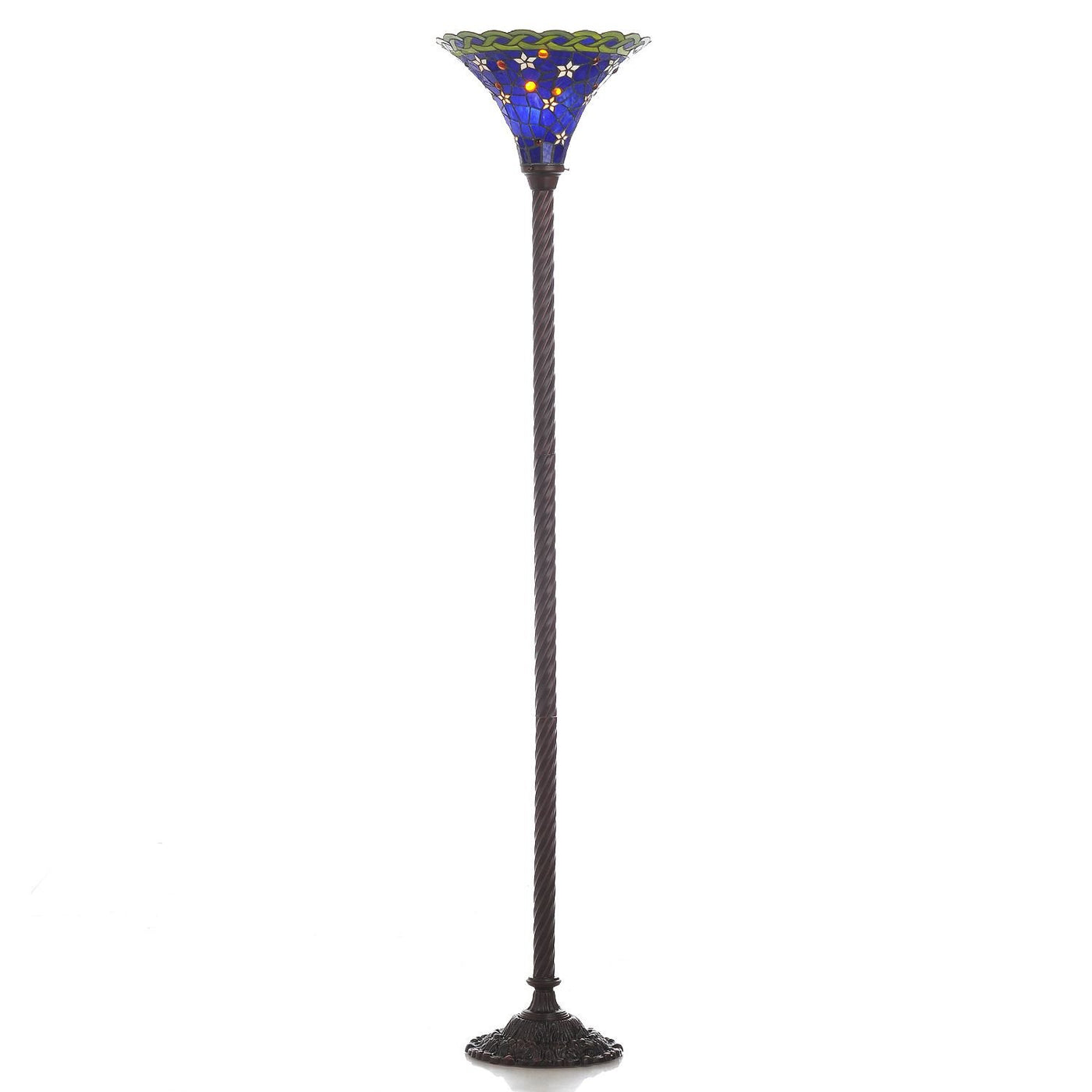 Product DescriptionThe elegant 15-inch shade is constructed of pieces of stained glass, each hand-cut and wrapped in fine copper foil. It is highlighted by a star pattern in elegant hues of blue and white. This lamp has a cast metal base, requires a 100-watt bulb for operation, and stands 72 inches tall. Note that shade colors will be darker and less vibrant when not illuminated.From the ManufacturerTiffany Style blue Star Torchiere. The color is dominant in a shade of blue and orange. The dimensions are 15-Inch L by 72-Inch by 15-Inch W. The base is made of white zinc metal. It has step on switch in it. It requires 1 bulb of 60watts. It has more than 200 pieces of cut glass. Each glass is individually cut wrap around copper foil and sottered together.