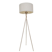 This tripod floor lamp features a polished brass finished and can be beautifully displayed in any room in your home. It features a beige colored canvas shade that diffuses light to create a welcoming glow. This floor lamp will complement your gorgeous home decor with its contemporary design.