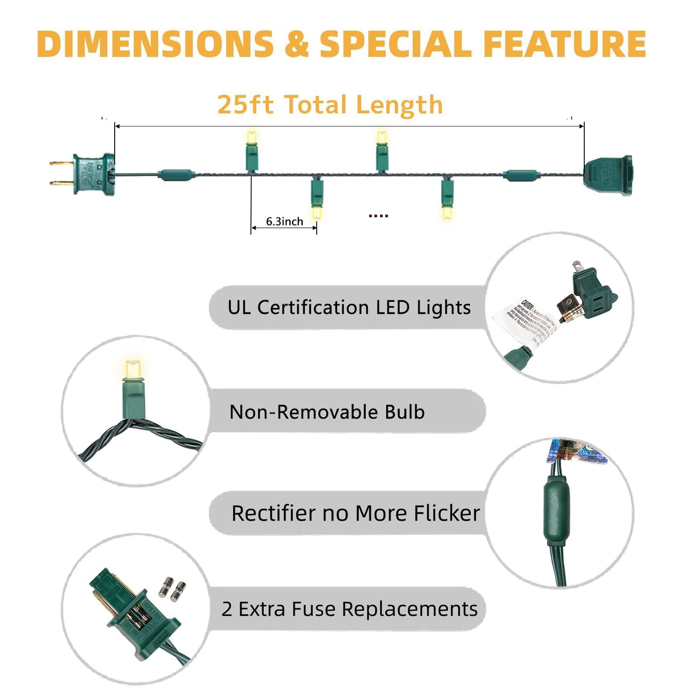 Q: What is the length and count of the bulbs in this string light set?A: This string light set is 25 feet long and includes 50 mini lights, providing ample coverage for your holiday decorations.