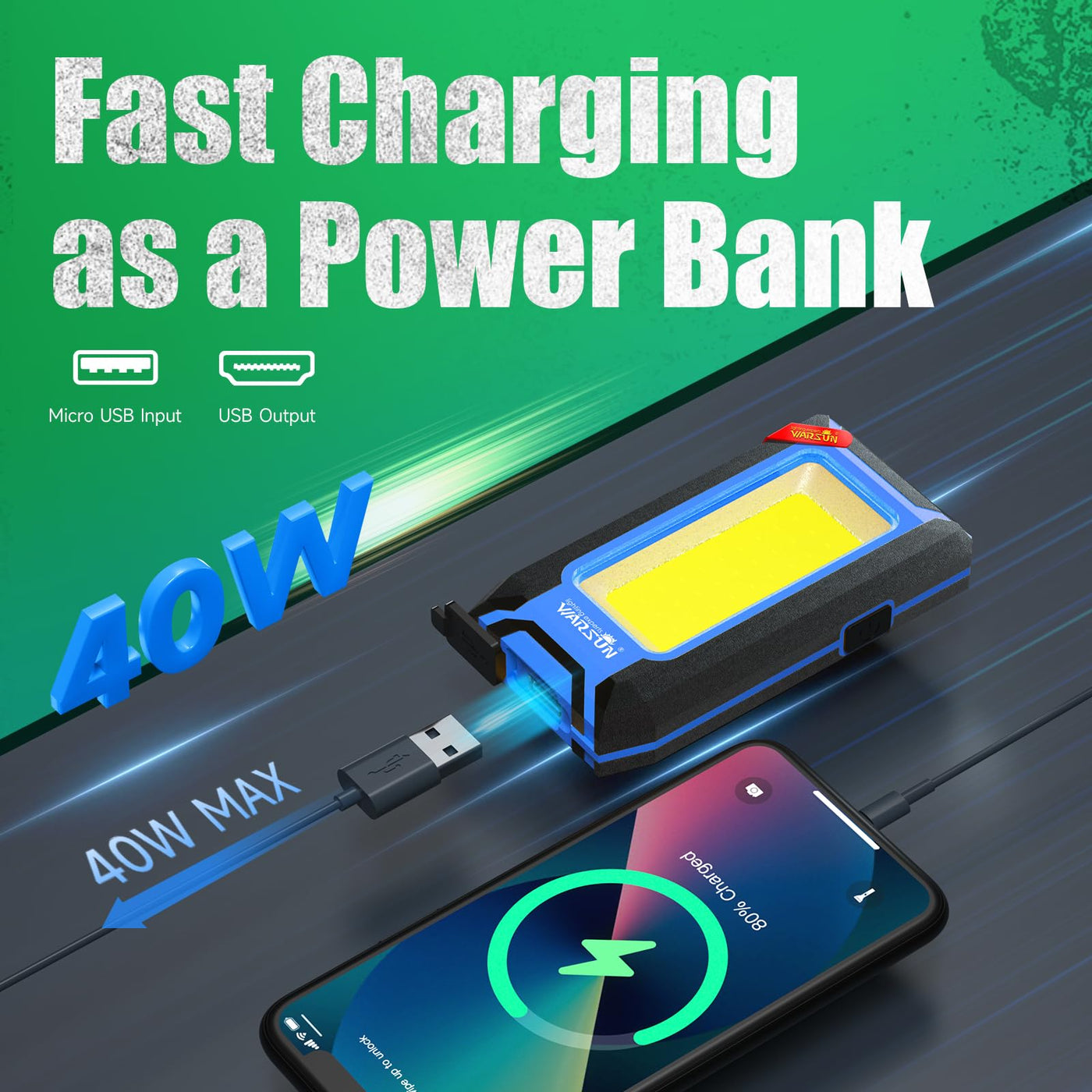 WARSUN Super Bright COB Light. With a maximum output of 40W and 1500 LM. Equipped with three different brightness modes, it's perfect for any situation. A sturdy aluminum alloy construction and 4.9ft drop test ensure unmatched durability. Also with a built-in magnet and hook, it's incredibly versatile whether in your garage or out in nature. Use it for camping, fishing, car repair, or any emergency. The work flashlight also features a USB port for charging mobile devices. Enjoy peace of mind with the 100% satisfaction guarantee and 30-day no hassle money-back promise.