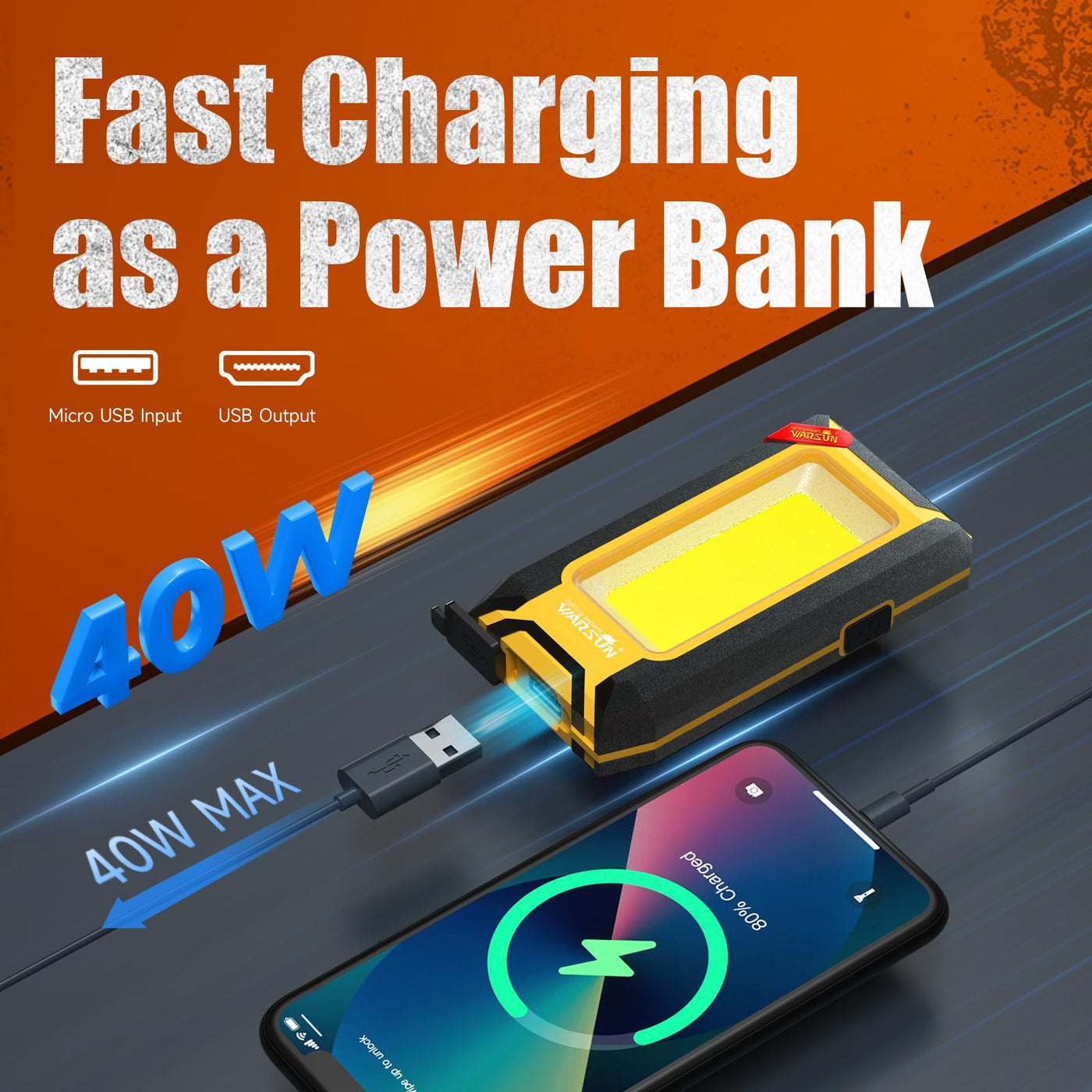 WARSUN Super Bright COB Light. With a maximum output of 40W and 1500 LM. Equipped with three different brightness modes, it's perfect for any situation. A sturdy aluminum alloy construction and 4.9ft drop test ensure unmatched durability. Also with a built-in magnet and hook, it's incredibly versatile whether in your garage or out in nature. Use it for camping, fishing, car repair, or any emergency. The work flashlight also features a USB port for charging mobile devices. Enjoy peace of mind with the 100% satisfaction guarantee and 30-day no hassle money-back promise.