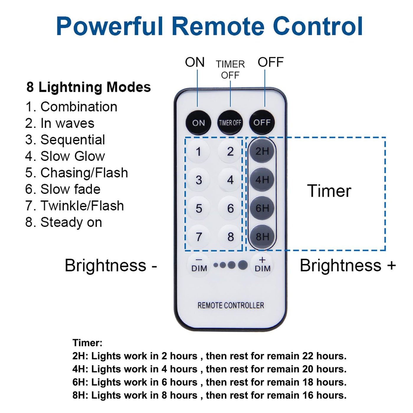 Q: How many lighting modes are available with the remote?A: The string lights come with 8 different lighting modes that can be easily controlled using the remote, allowing you to choose from combination, in waves, sequential, slogs, chasing/flash, slow fade, twinkle/flash, and steady on.