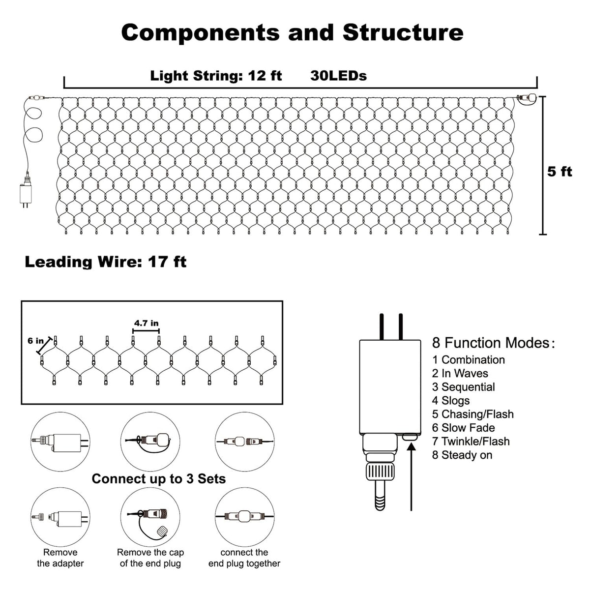 - **Easy Installation & Customization**: The net lights come in a generous size of 12ft x 5ft, with a 17ft lead cable for flexible setup. You can also extend the length by connecting up to 3 light chains (maximum of 1000 LEDs) to customize your lighting area as desired.