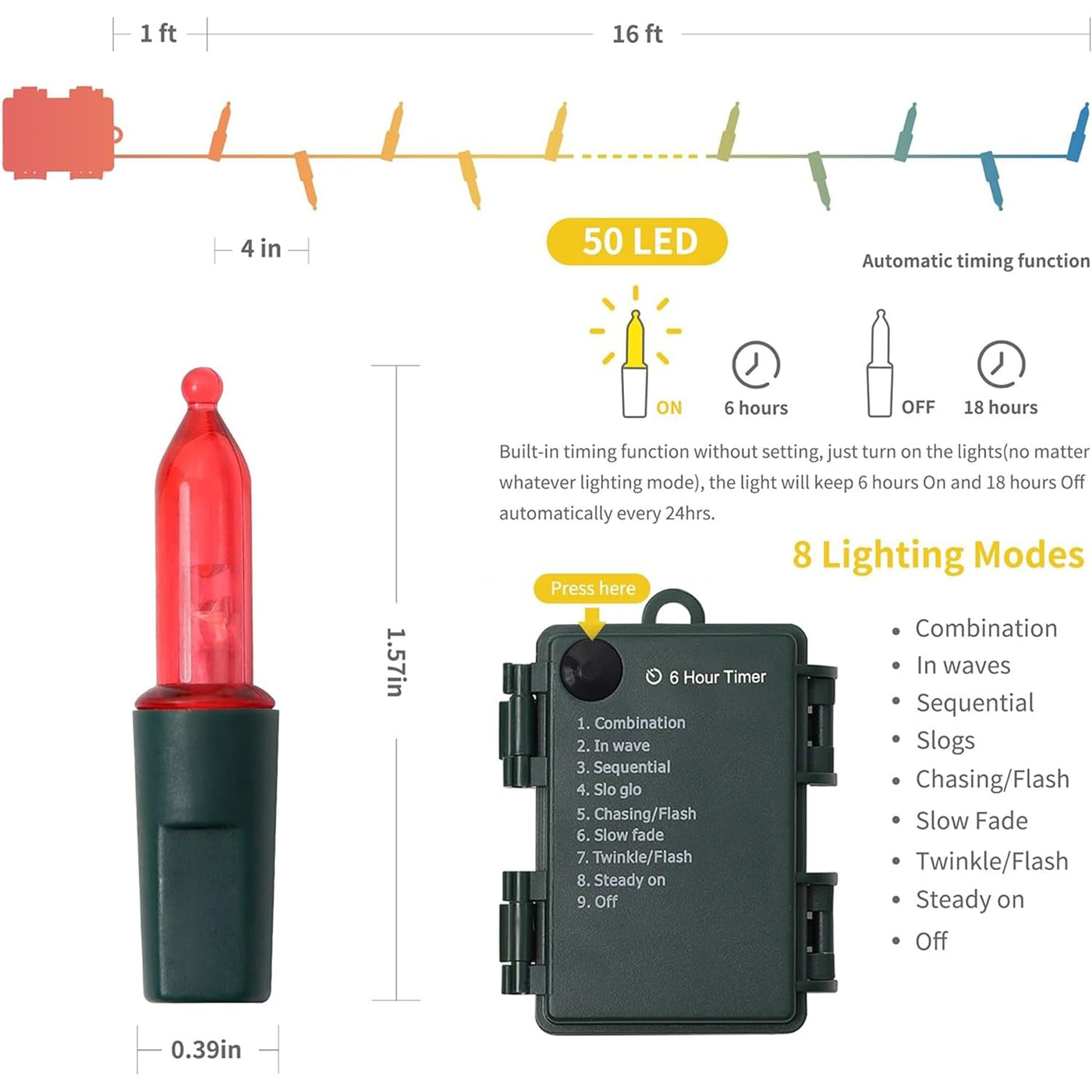 Q: How does the timer function work on these Christmas lights?A: These lights come with a built-in auto timer function that operates on a 6 hours ON and 18 hours OFF cycle. Simply turn on the lights at 6 p.m., and they will automatically turn off at midnight and turn back on at 6 p.m. the next day, repeating the cycle without needing a daily reset.