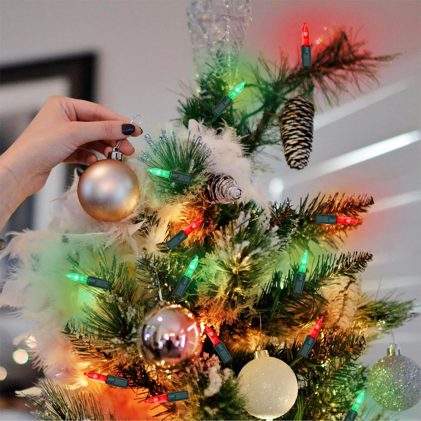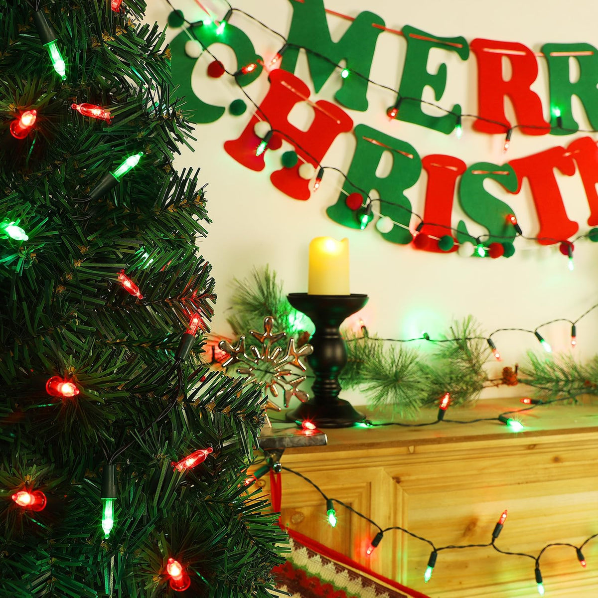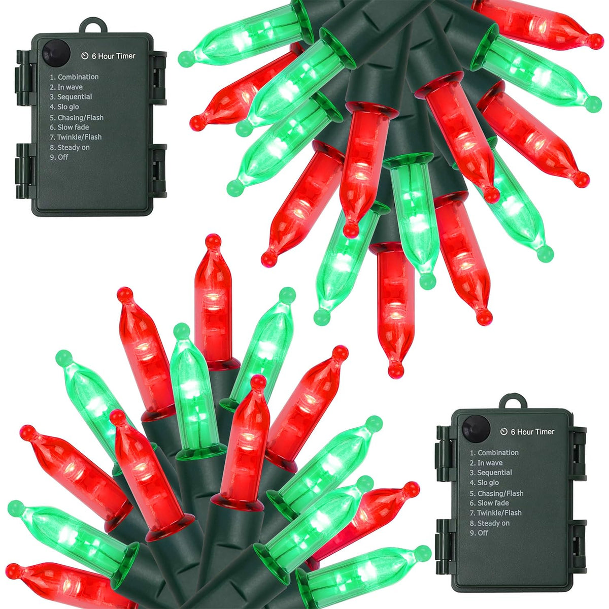 Specifications: Light Color: Red & Green LED Count: 50 pcs Each Total Length (end to end): 17FT Each String lights: 16FT Each Waterproof Level: IP44 Power Supply: Battery Powered Timer: 6 hours on and 18 hours off Package Including: 2 x 50 LED Red & Green Xmas Mini String Lights